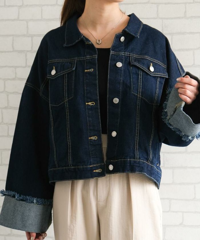 このワイドスリーブデニムジャケットは、さまざまなコーディネートに取り入れやすいアイテムです。