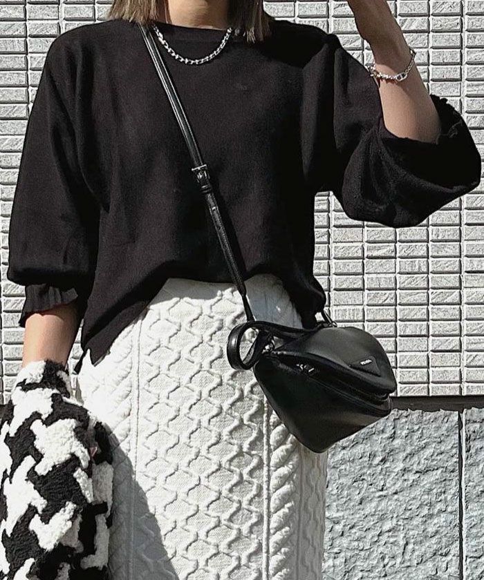 鎖骨に沿ったクルーネックとデザイン編みで首元も綺麗に魅せてくれます。