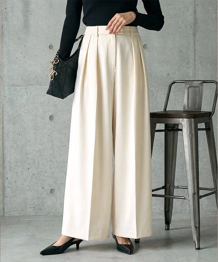 フロントに施したタックがほどよい立体感を生み出し、気になる腰回りや太ももをすっきりカバーしてくれるワイドパンツ。