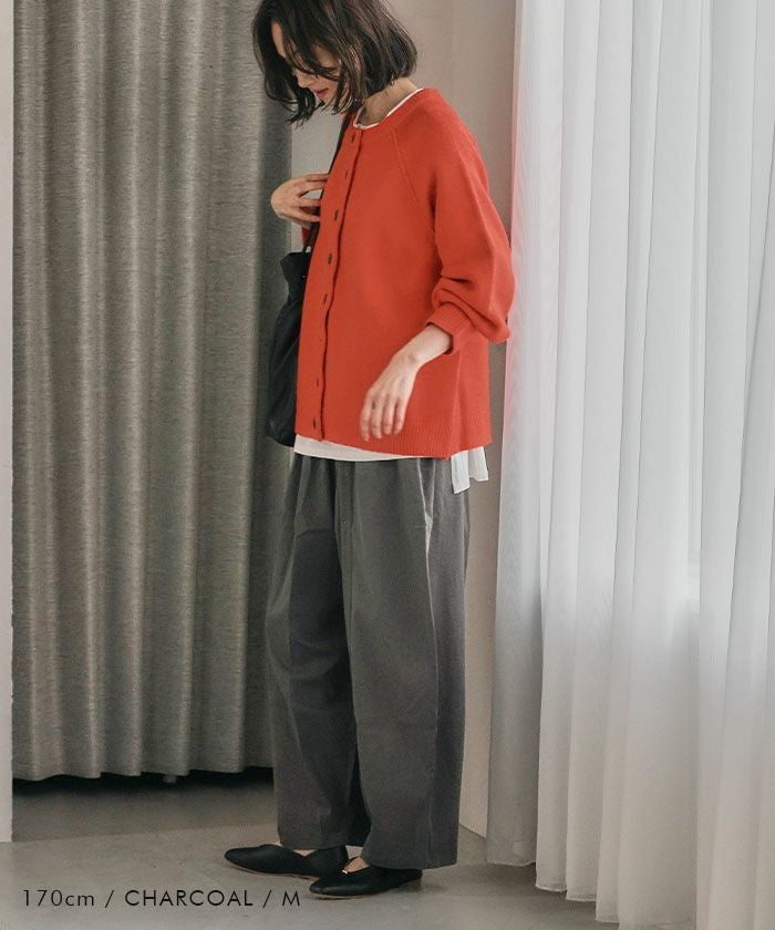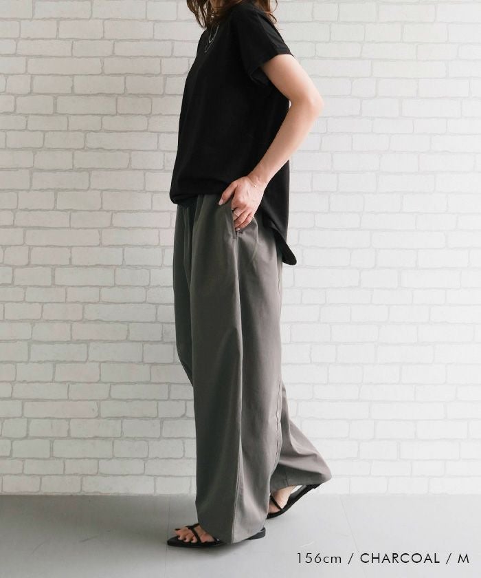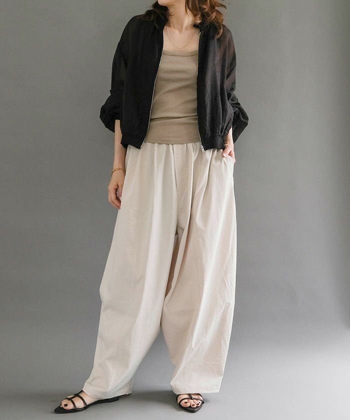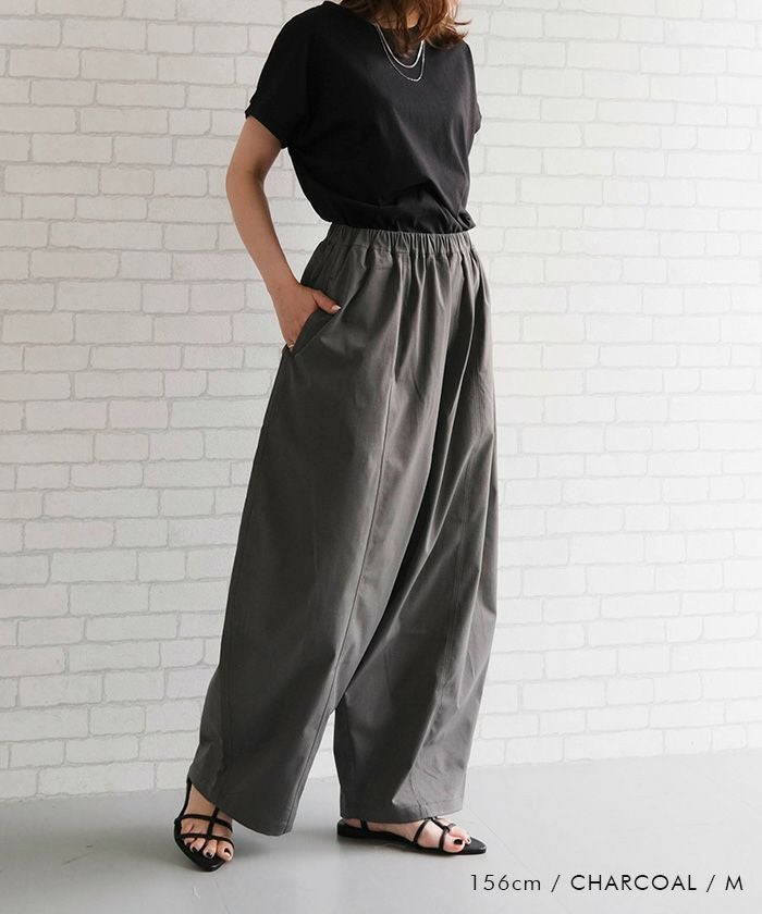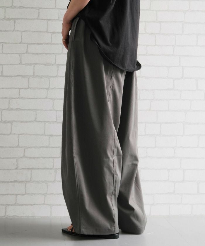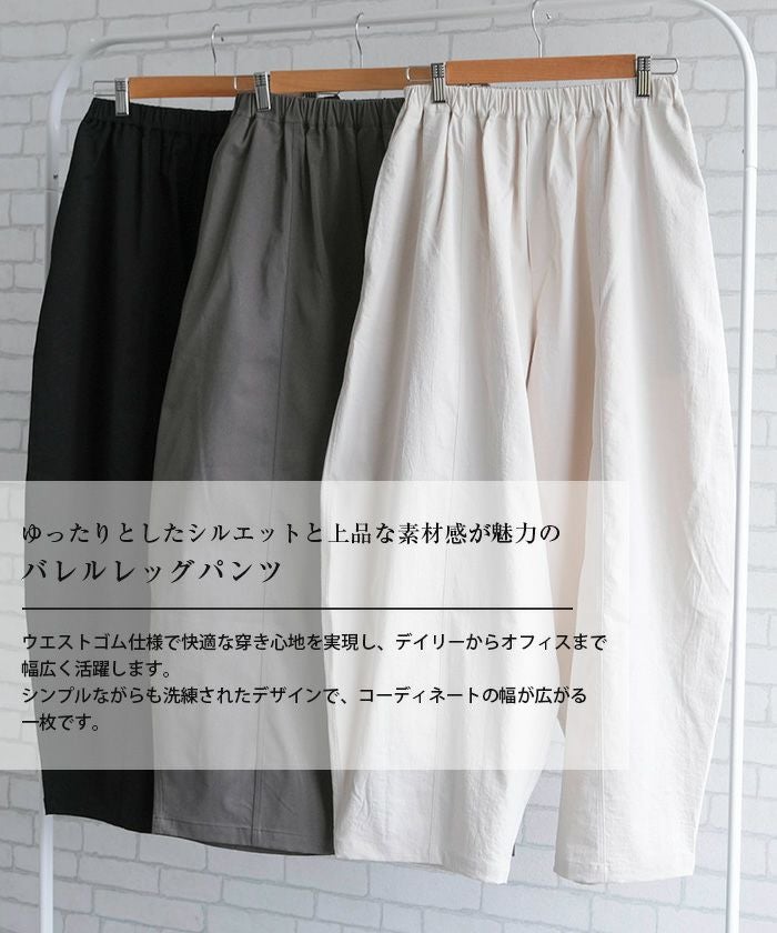 ゆったりとしたシルエットと上品な素材感が魅力のバレルレッグパンツ。