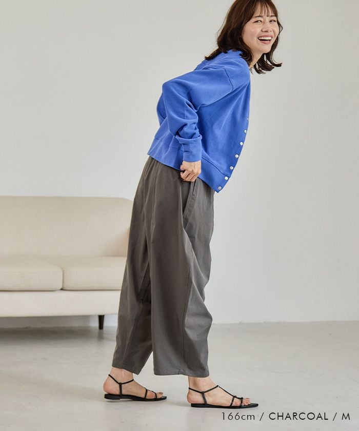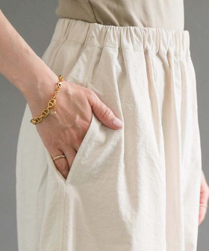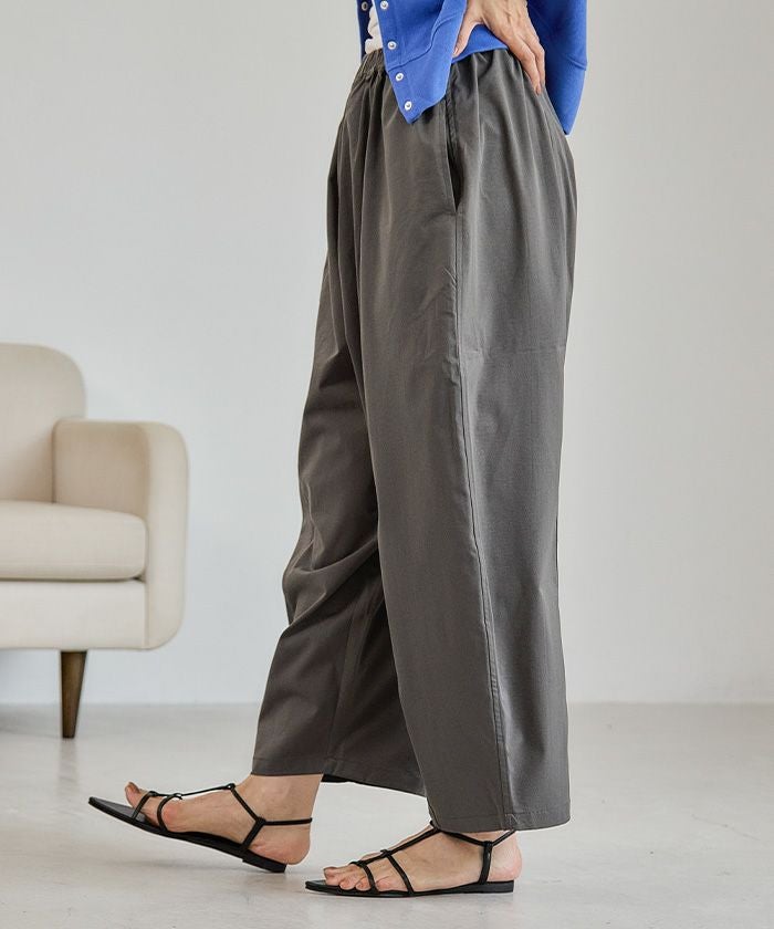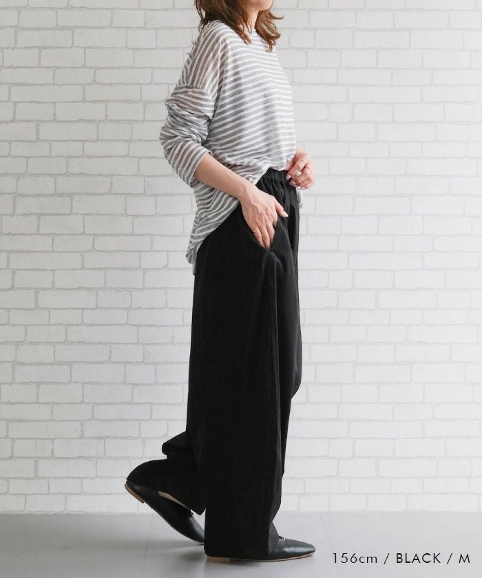 ウエストゴム仕様で快適な穿き心地を実現し、デイリーからオフィスまで幅広く活躍します。