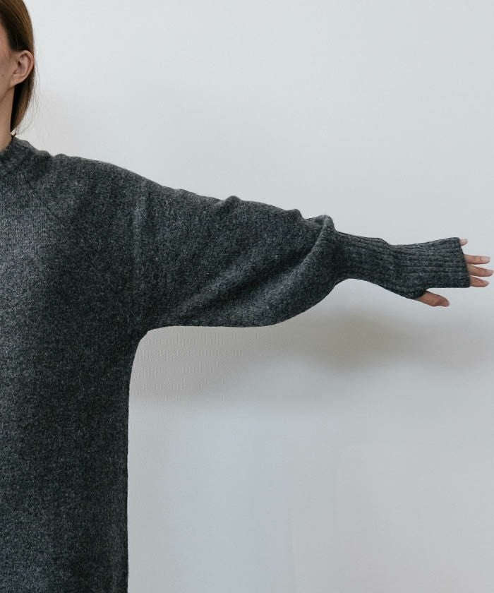 指穴とスリーブのほどよいデザインアクセントが、シンプルになりがちなニットワンピをぐっと洗練させています。