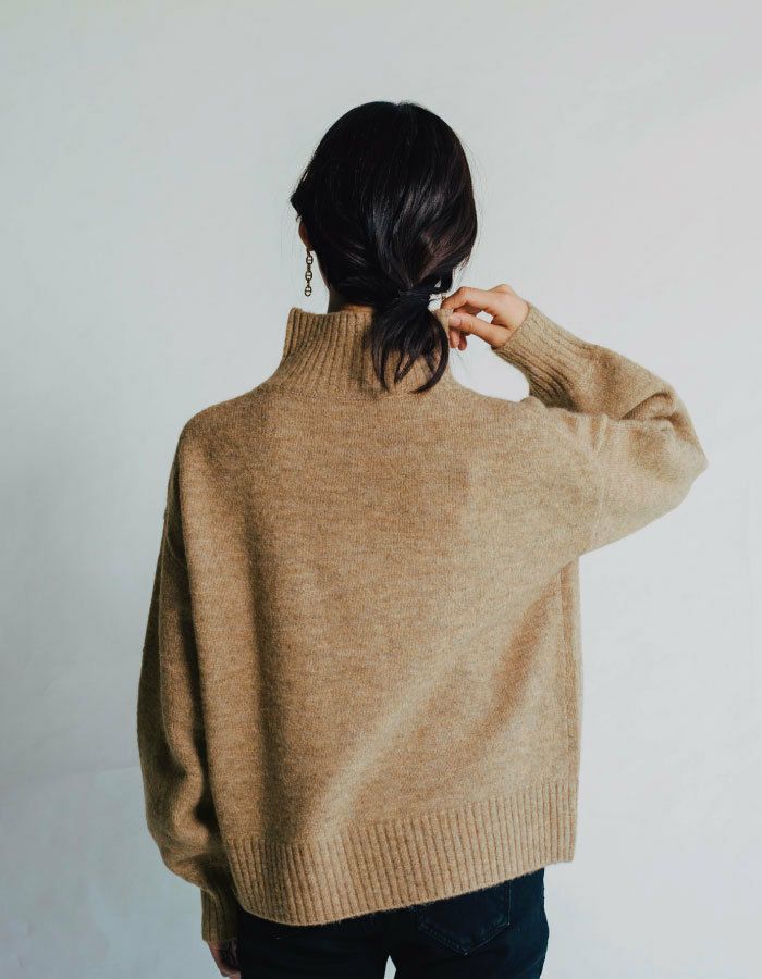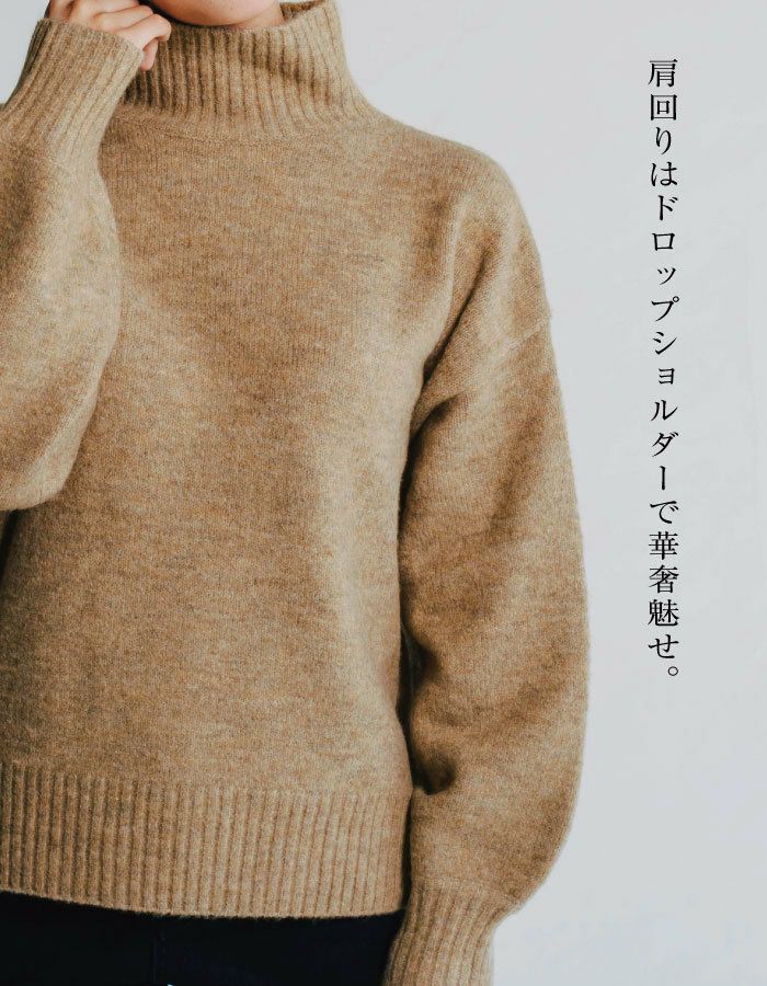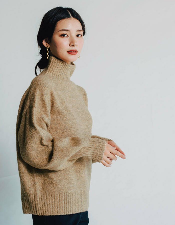 モヘアのようなふわふわの質感でチクチクせず快適な着心地。 ハイネック部分や袖・裾はリブ編みで立体的な表情をプラスしてこなれ感のある印象に。