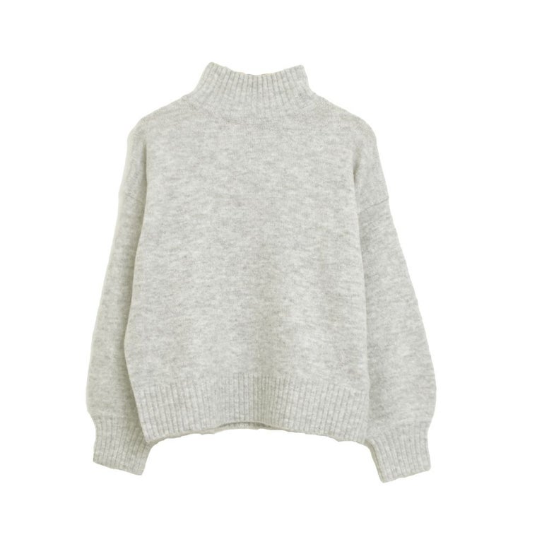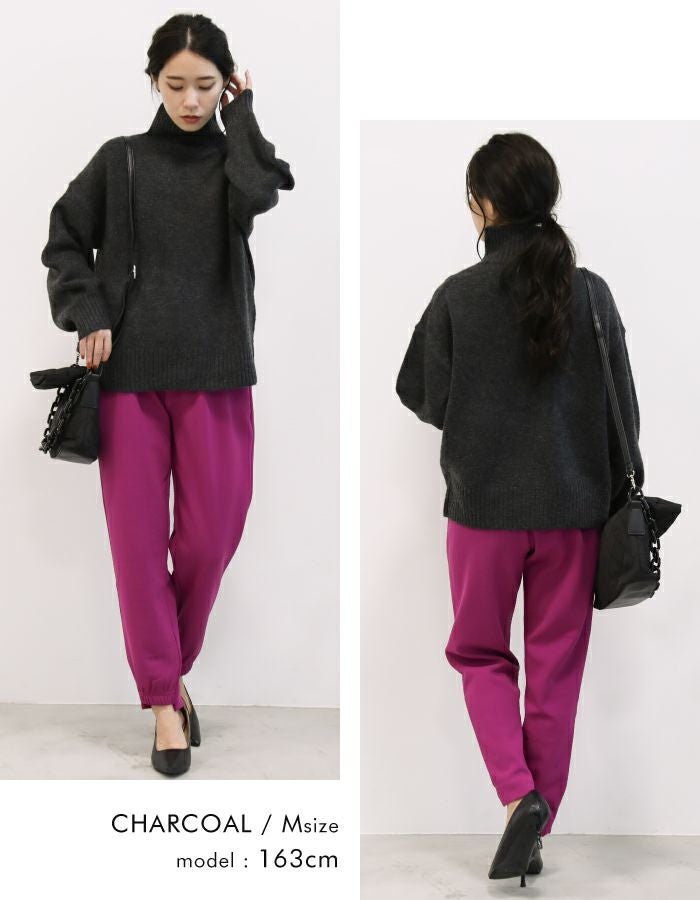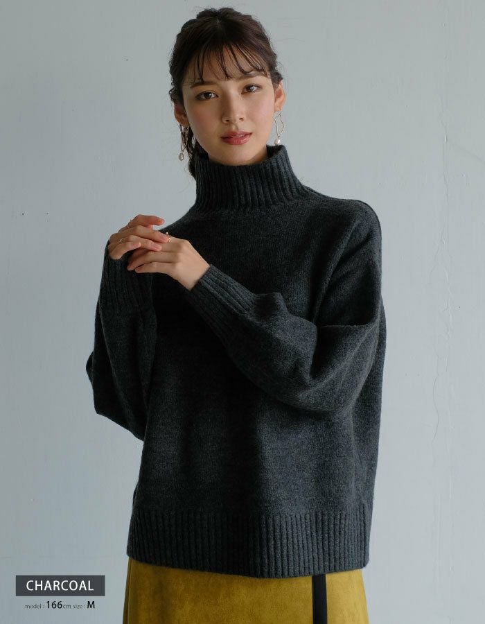 • ゆとりのあるシルエットのボトルネックボリューム袖ニット トップス。