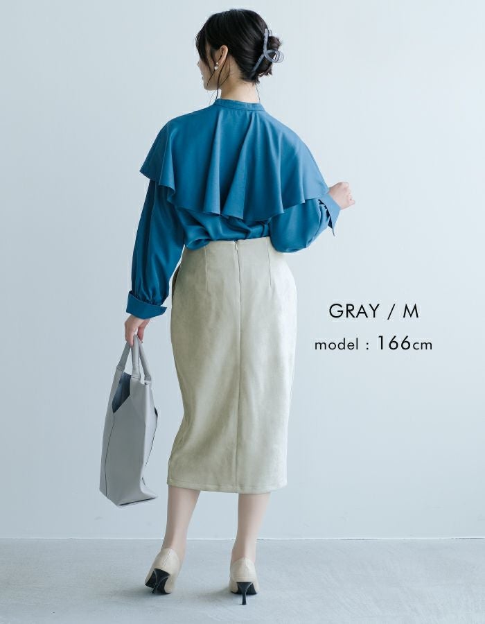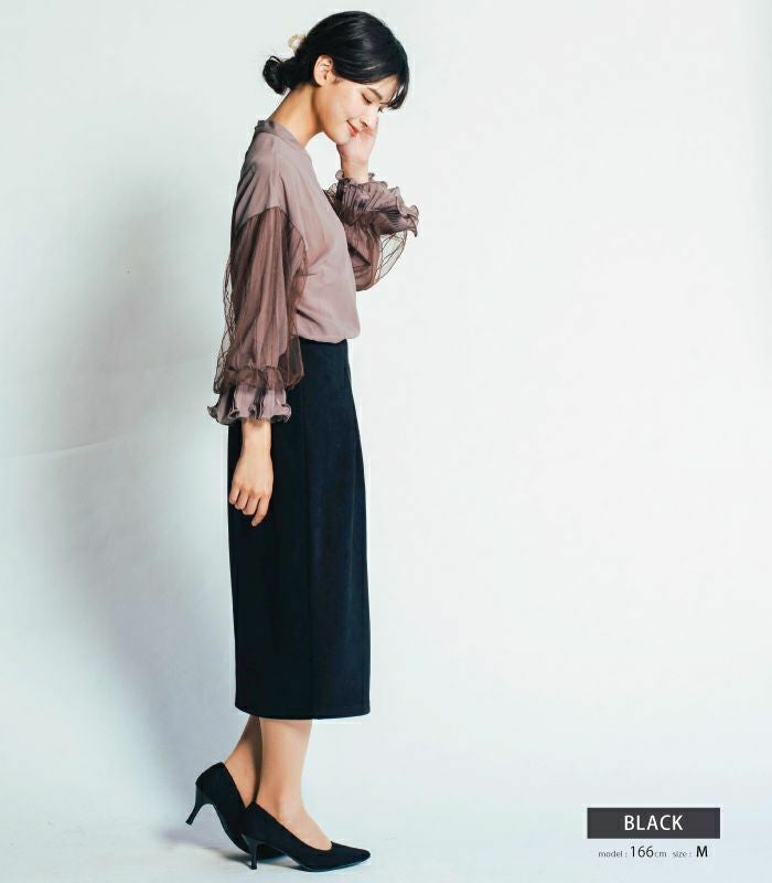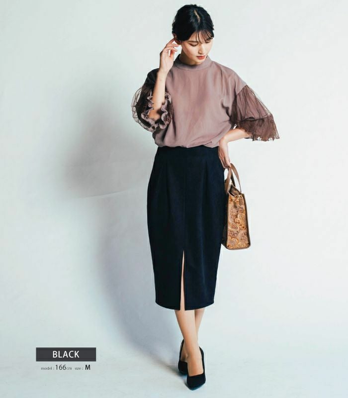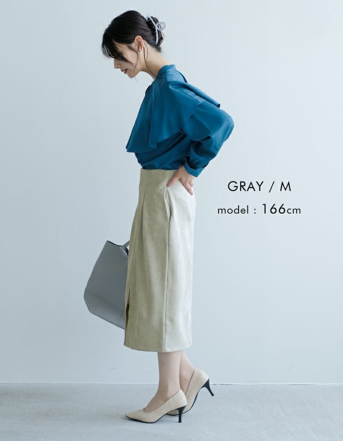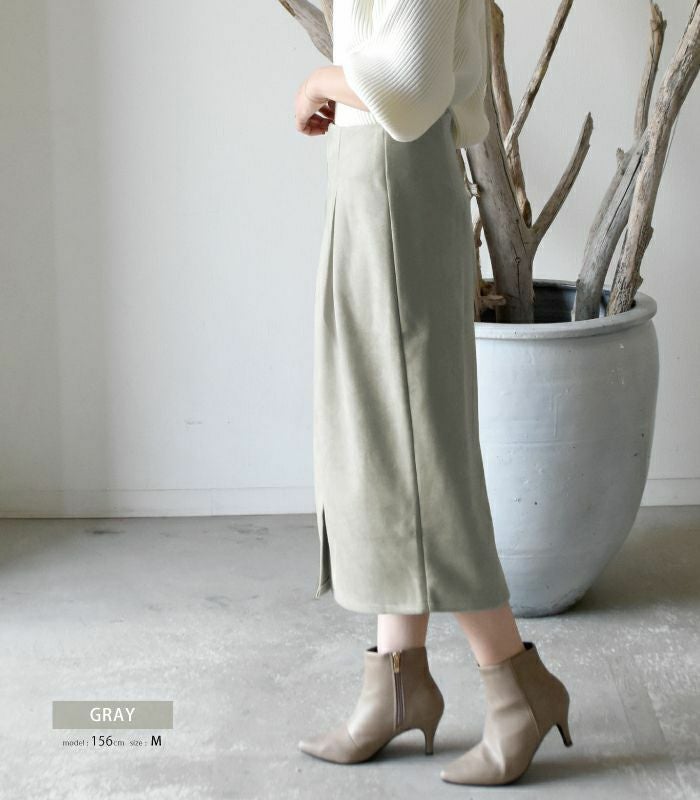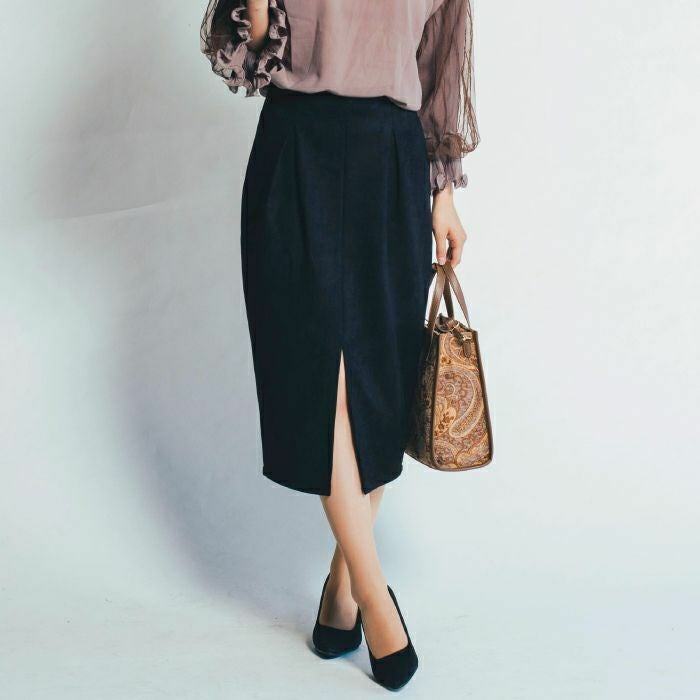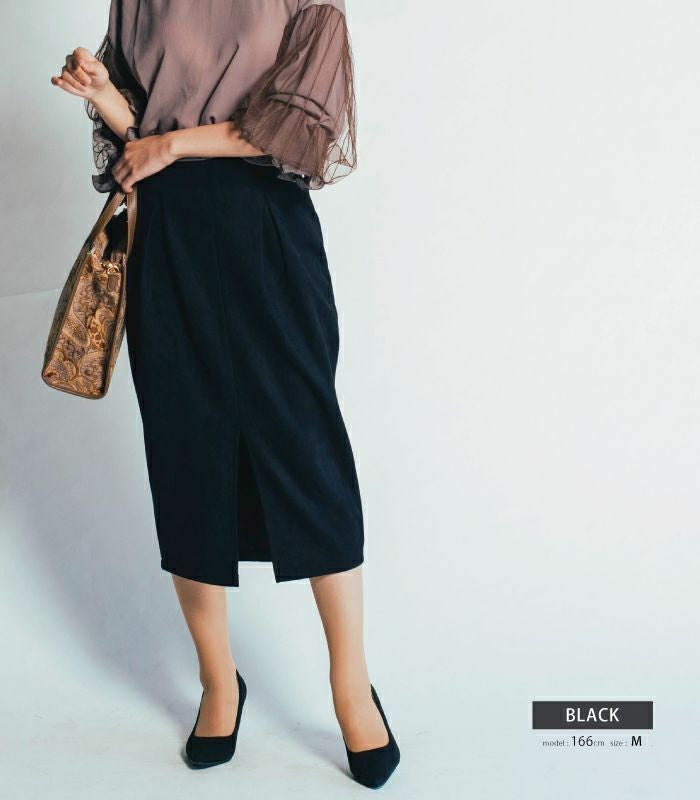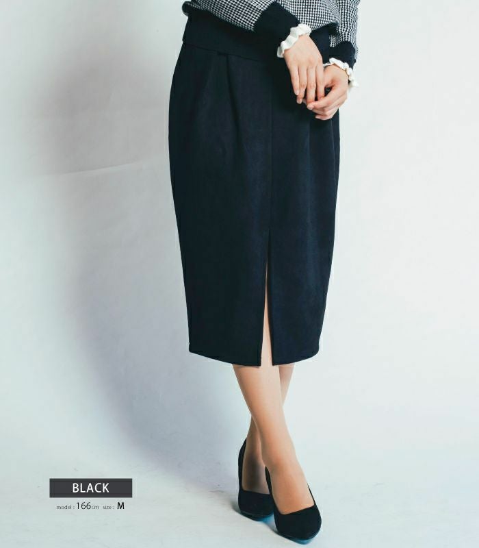 • フロントのスリットが抜け感をプラスするハイウエストタックタイトスカート 。