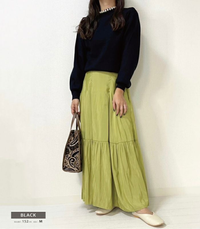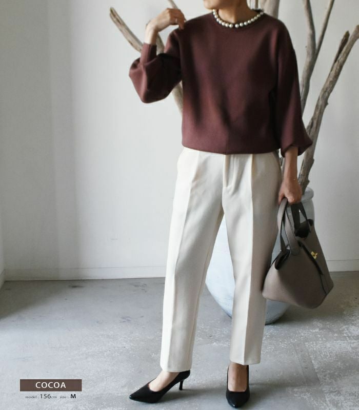 ネックレスがいらない華やかな首元と、ふわっとした袖が女性らしいシルエットを演出。 編み目が目立たないハイゲージニットだから、手触りも良く高見えで綺麗めカジュアルやオフィスコーデにも使える優秀トップス。