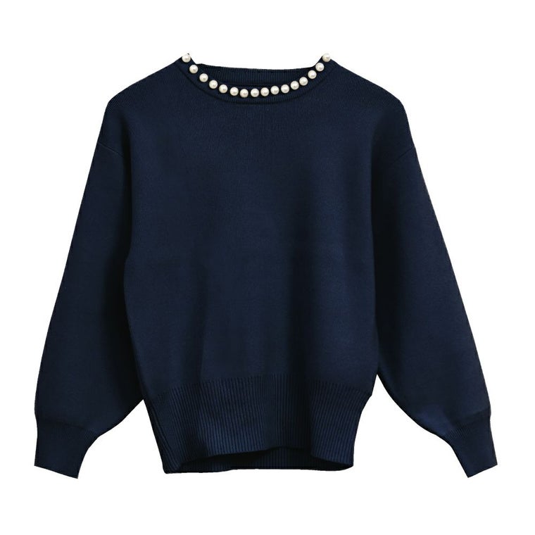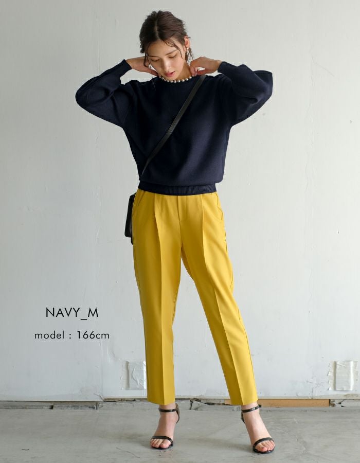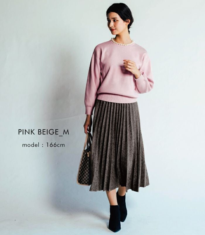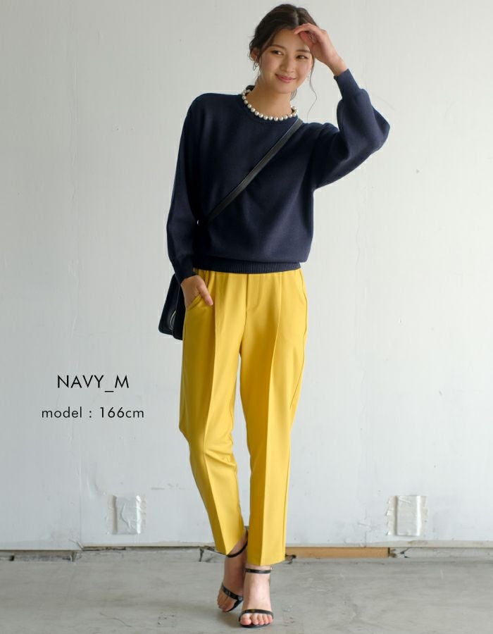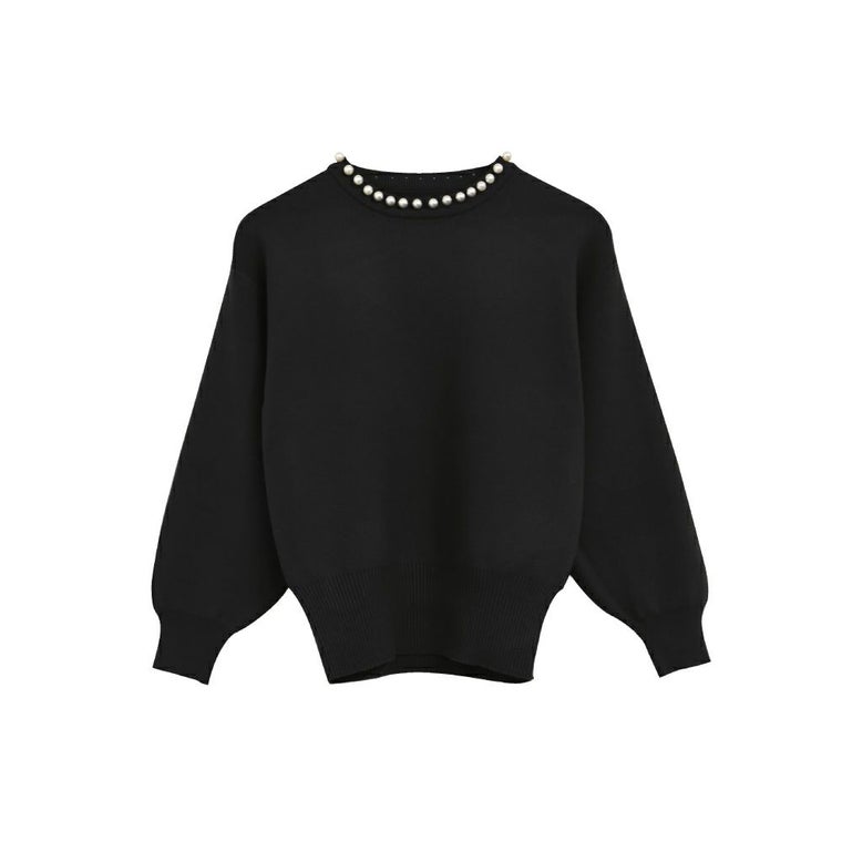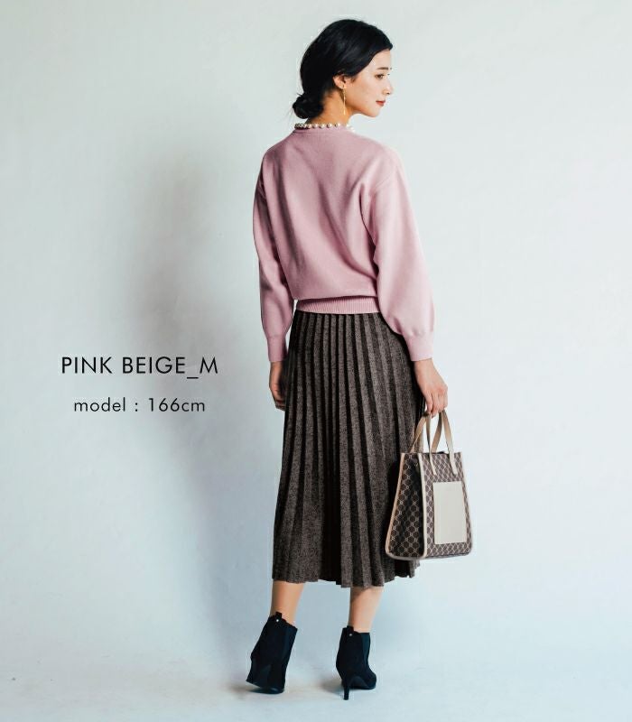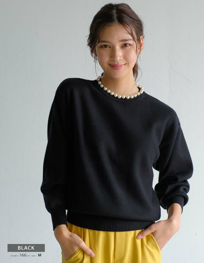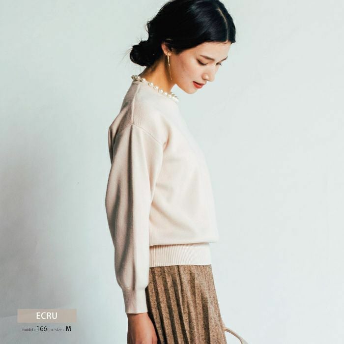 • クルーネックに大ぶりのパールを施した上品なニットトップス。