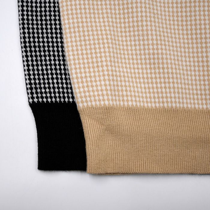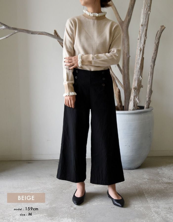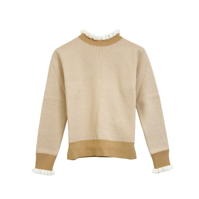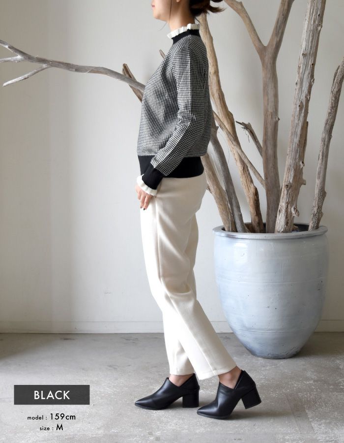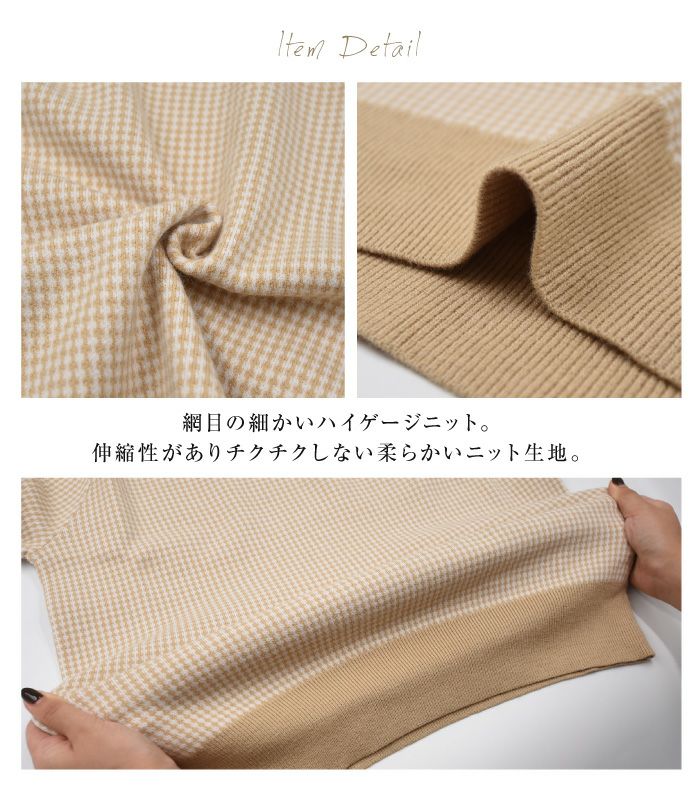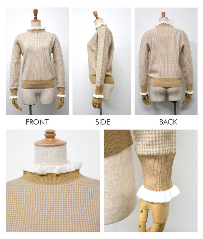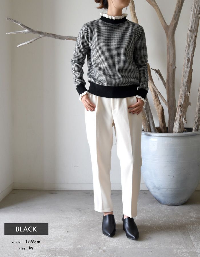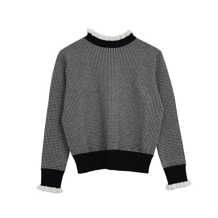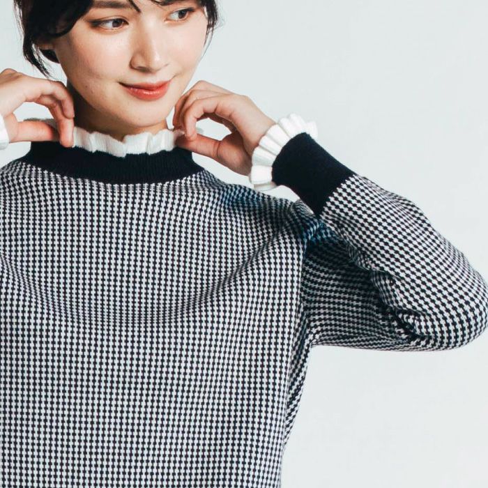 • 首元と袖口に施されたランダム幅の動きあるミニフリルが、顔まわりを華やかにソフトな印象と可愛さを演出してくれます。 千鳥格子に似た細かいチェック柄のニットは、レトロ感がありつつ洗練されたトレンドスタイルに。全体的にスリムなシルエット。