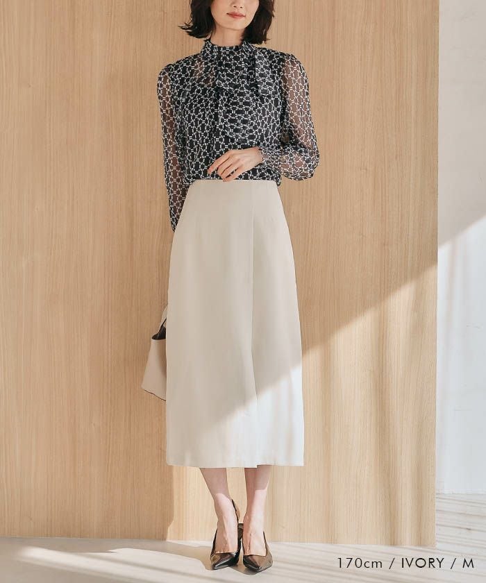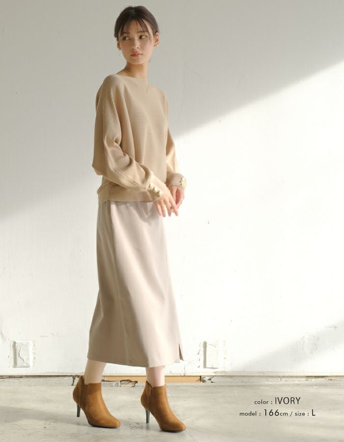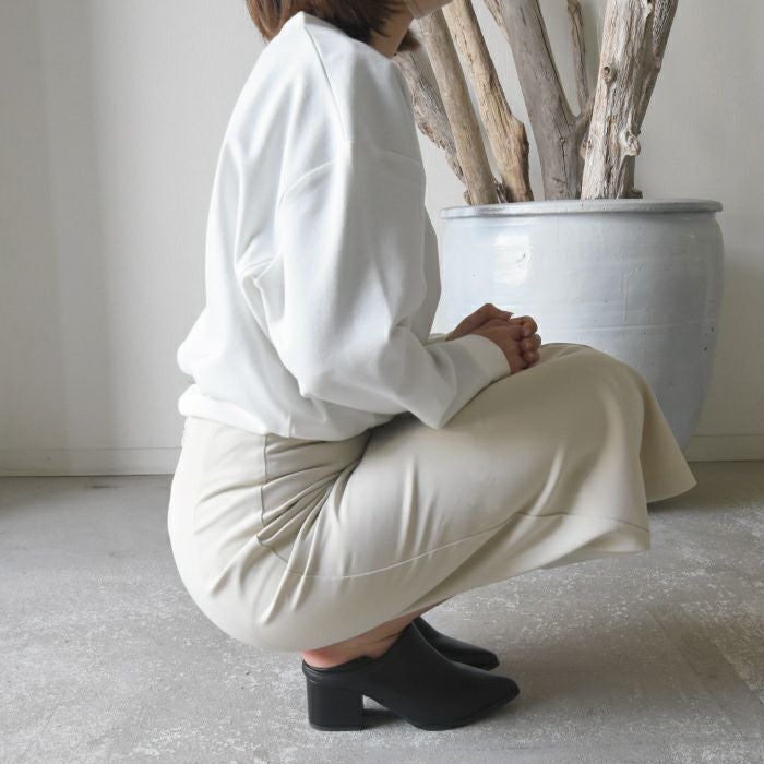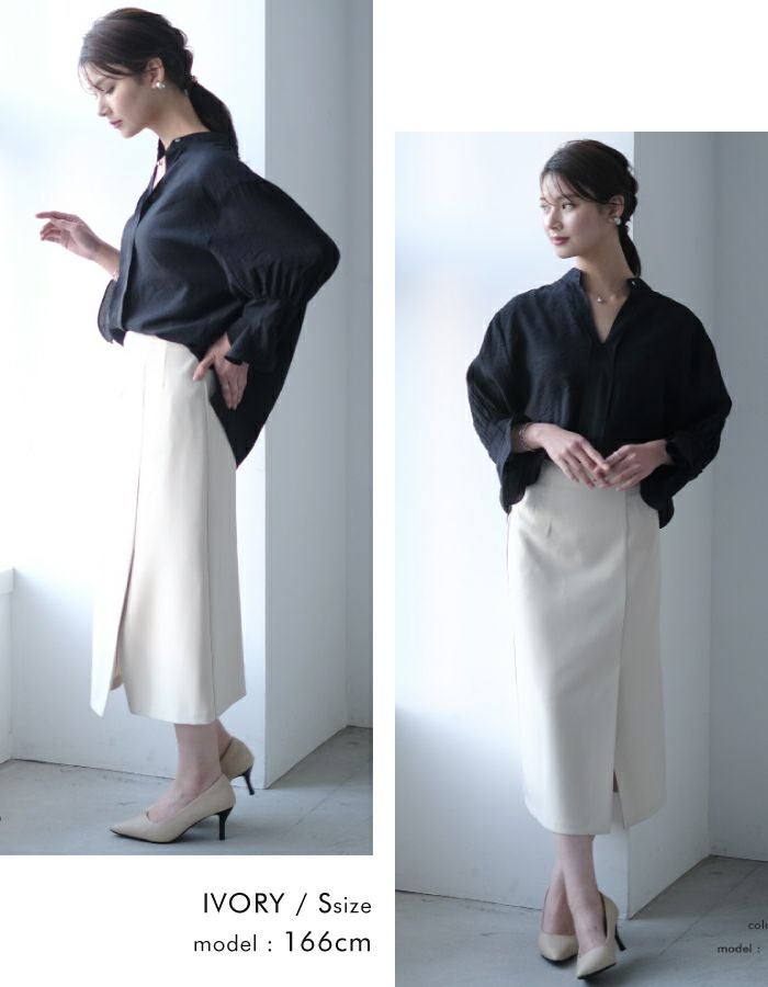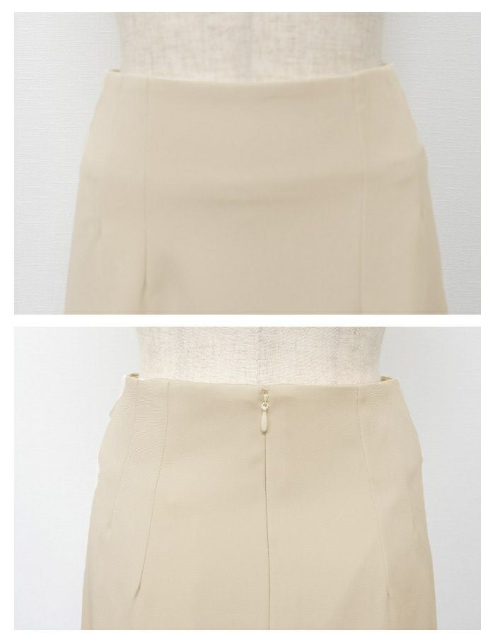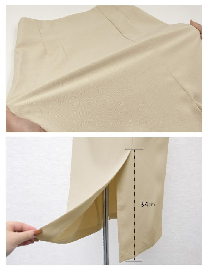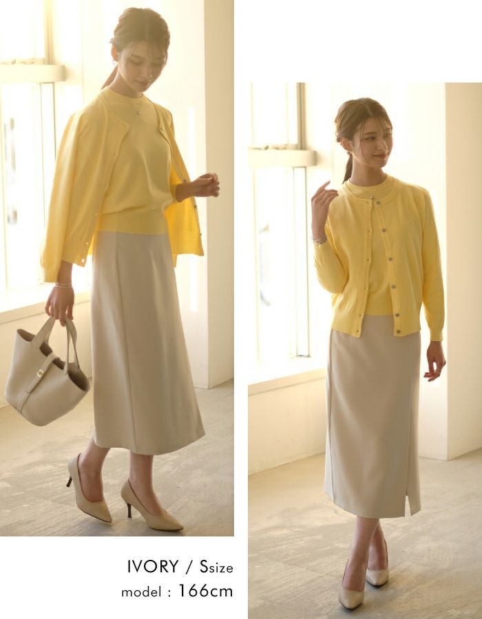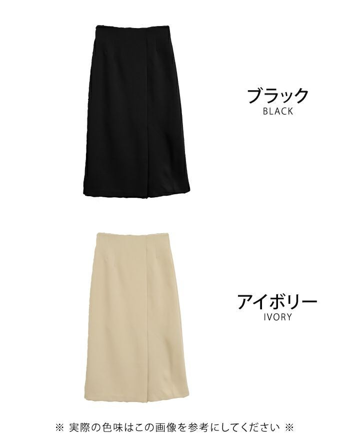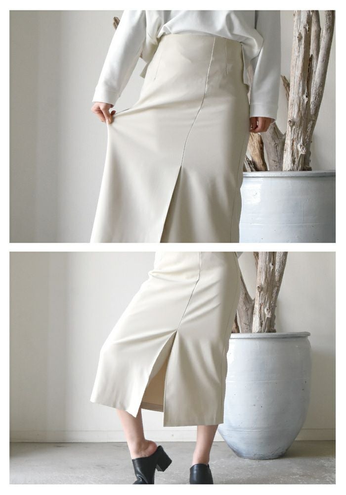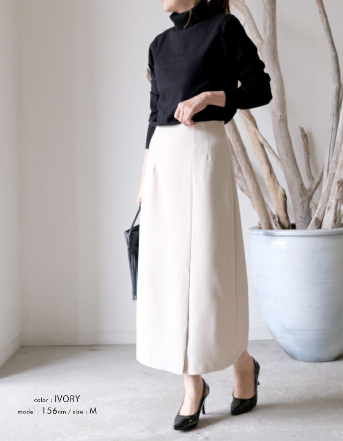 体のラインがひびきにくいHラインのすっきりシルエット。フロントに深いスリット入りで、足さばきも自由。全体的にストンときれいに落ちるラインで脚をより長く魅せてくれるアイテムです。