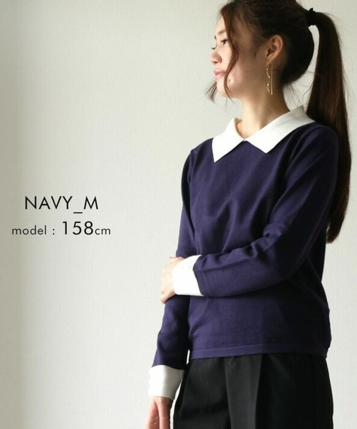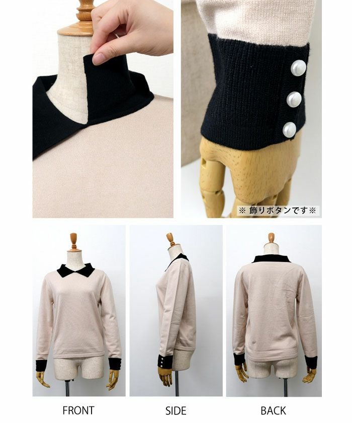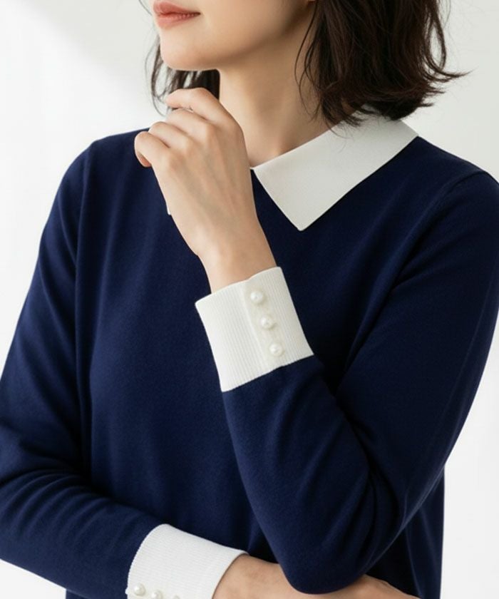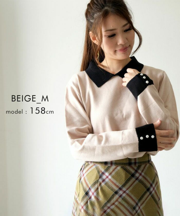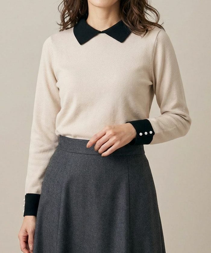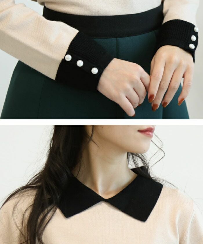襟の配色ディテールが可愛い、ハイゲージのニットトップス。 シンプルだけどこだわりの袖のパールで上品な女性らしさを演出。 スカートにもパンツにも、幅広く着回しが利くアイテムです。