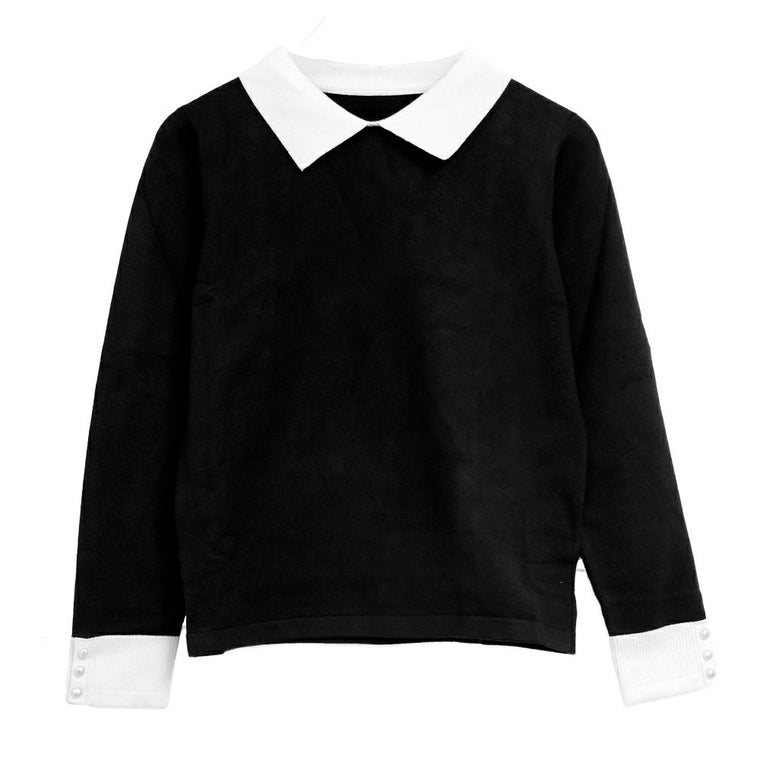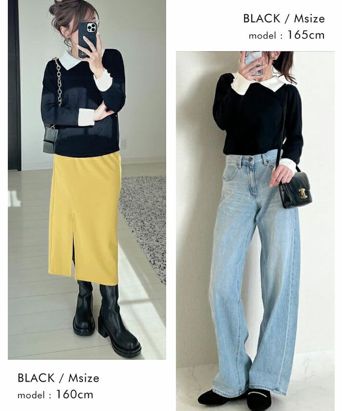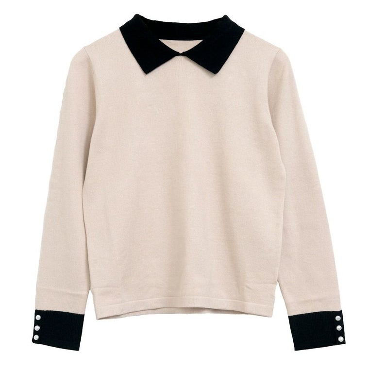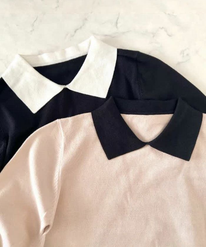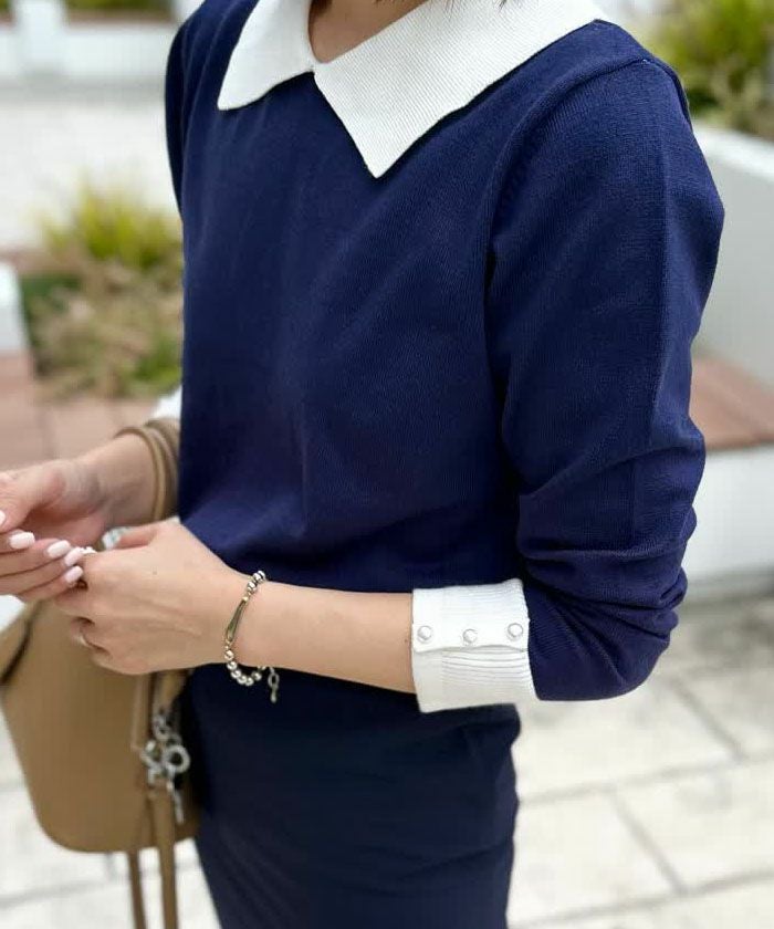 襟の配色ディテールが可愛い、ハイゲージのニットトップス。 シンプルだけどこだわりの袖のパールで上品な女性らしさを演出。 スカートにもパンツにも、幅広く着回しが利くアイテムです。