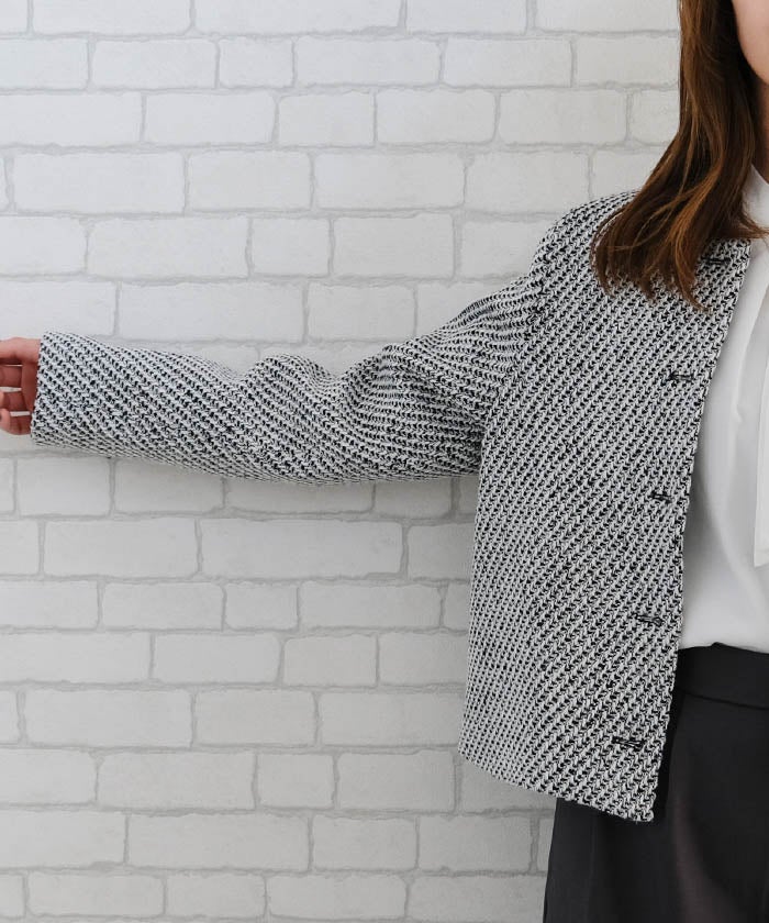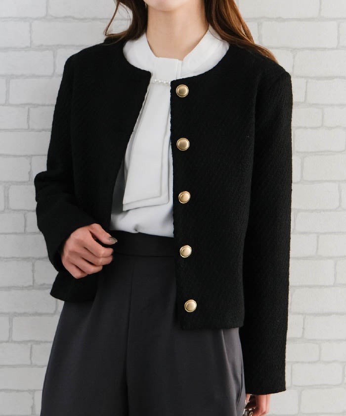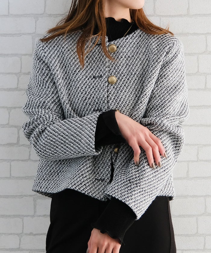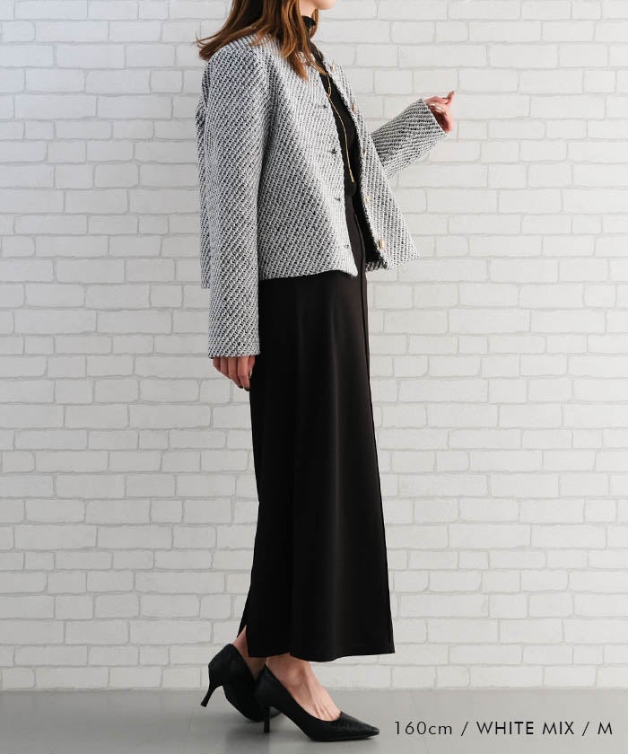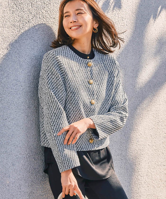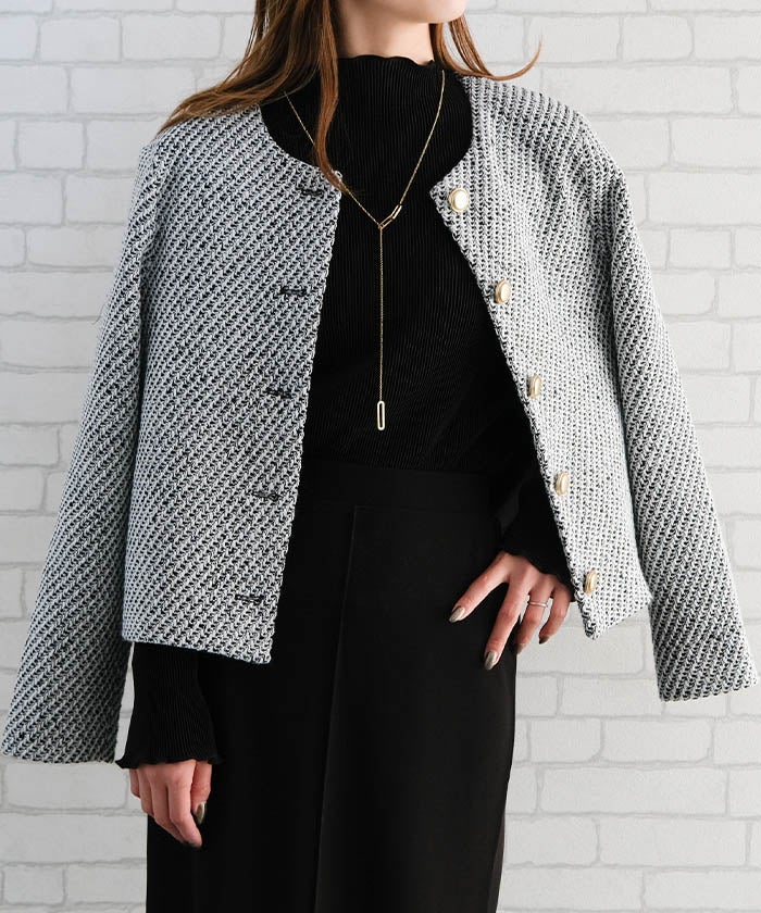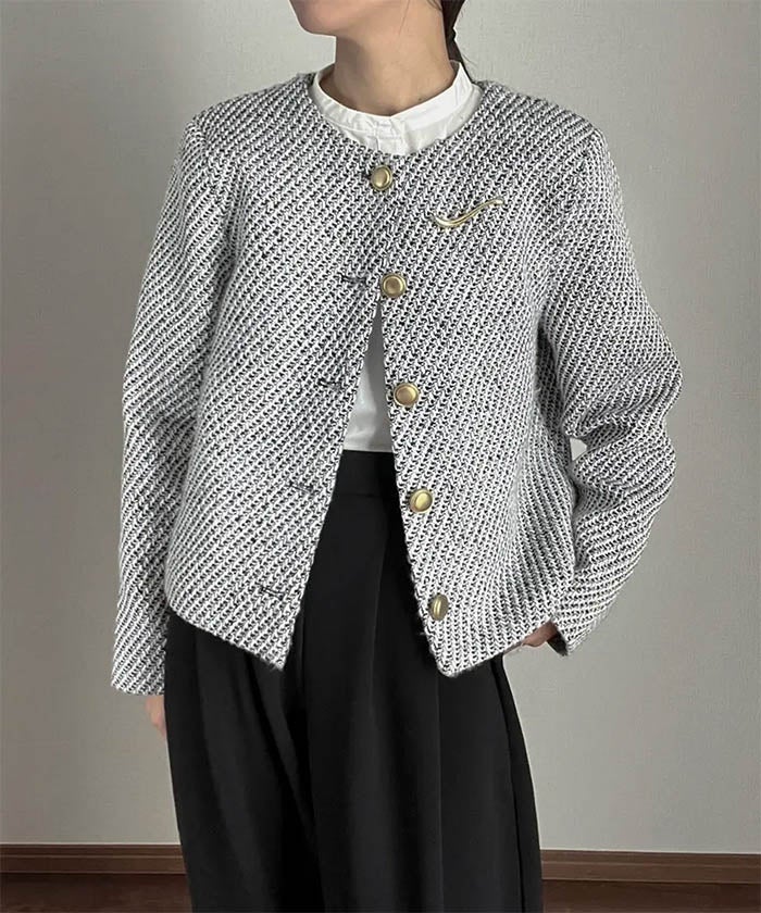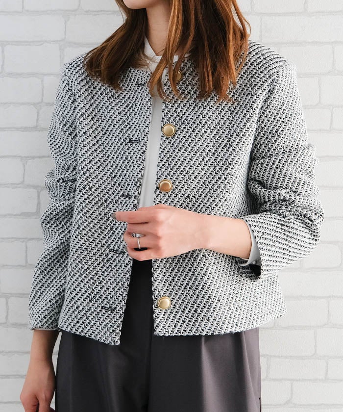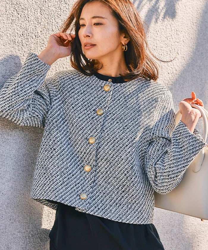 • シックな風合いが魅力のノーカラーツイードジャケット