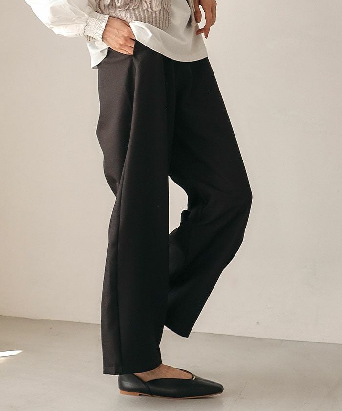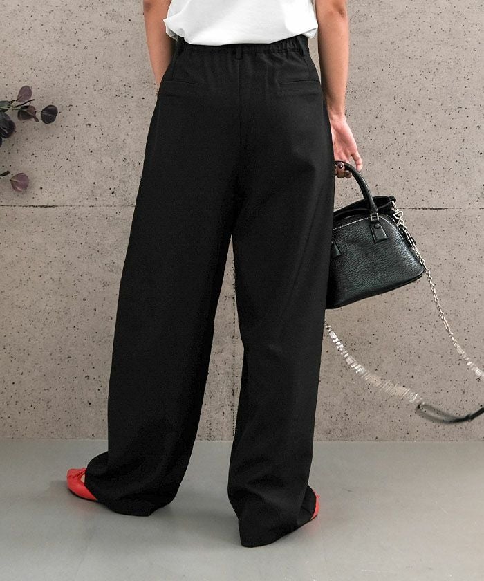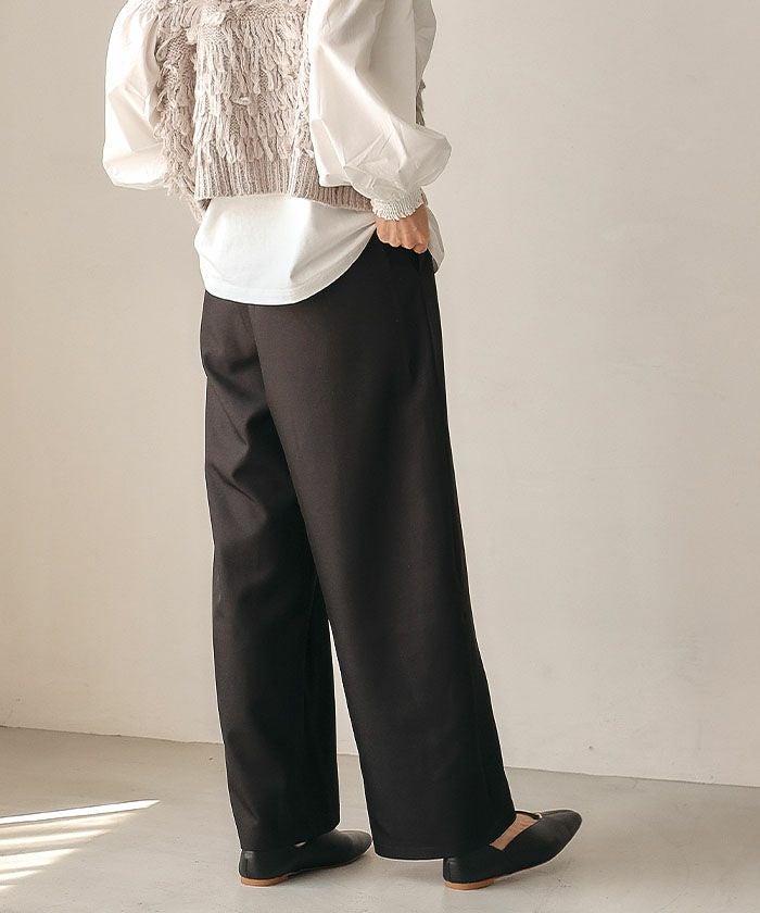 ウエストはフロントはタックではなくシンプルな仕様で、バック部分もゴムではなく、すっきりとしたフィット感を重視したデザインです。