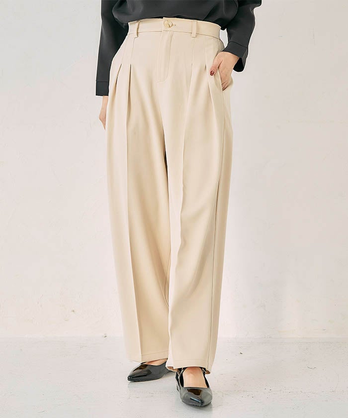 ボトムスはウエスト周りをすっきりとまとめつつ、程よいボリューム感で大人っぽい印象に。