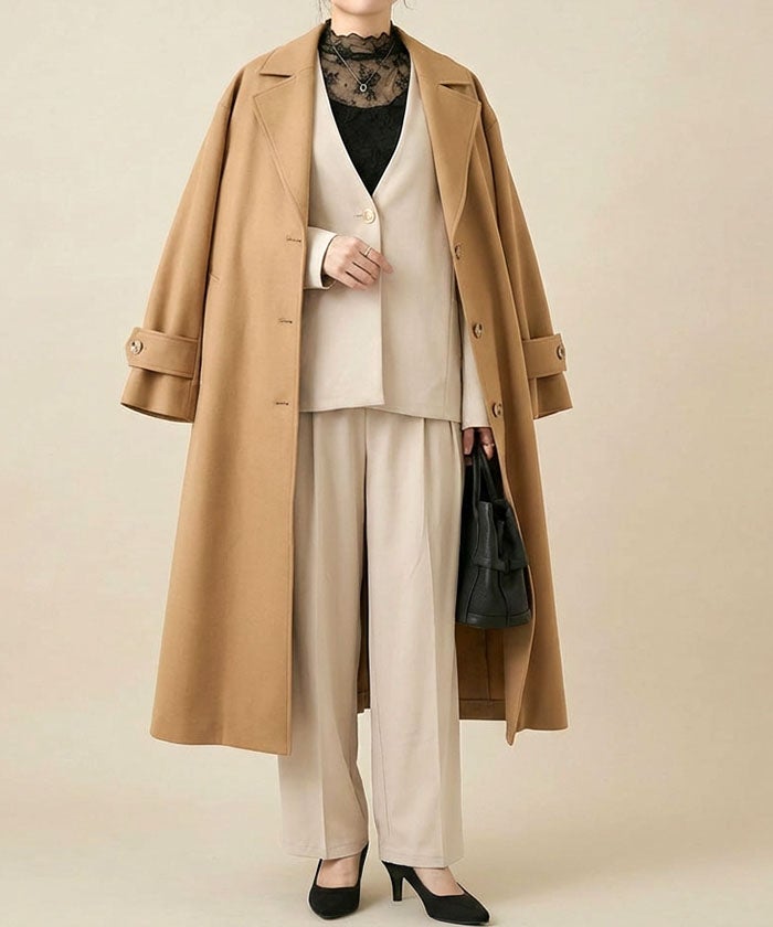 身体のラインを拾いすぎない設計で、自然に体型をカバーしながらも、だらしなく見えない絶妙なバランスに仕上げています。