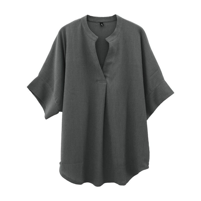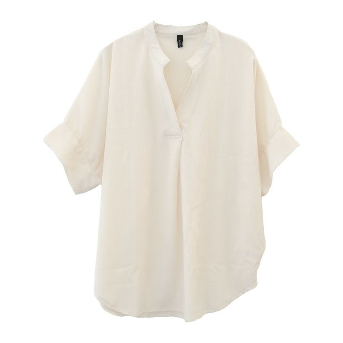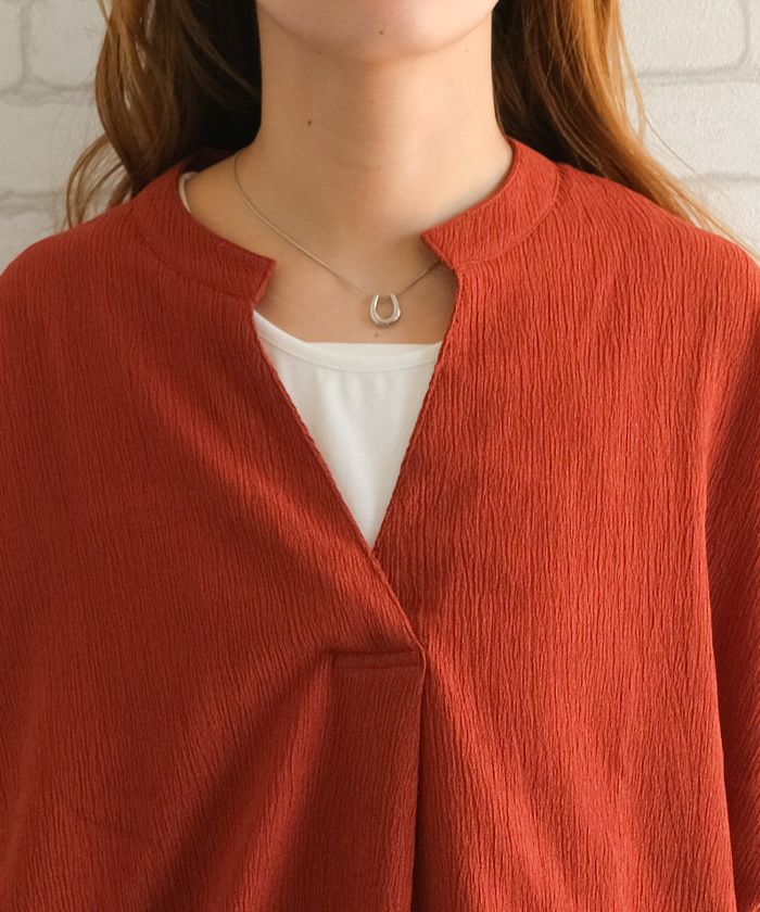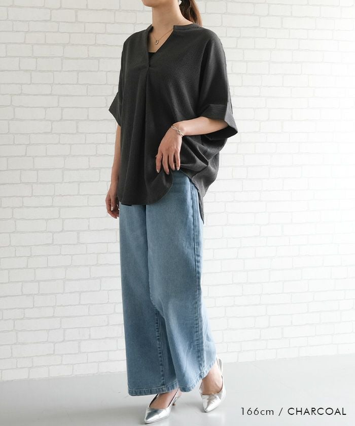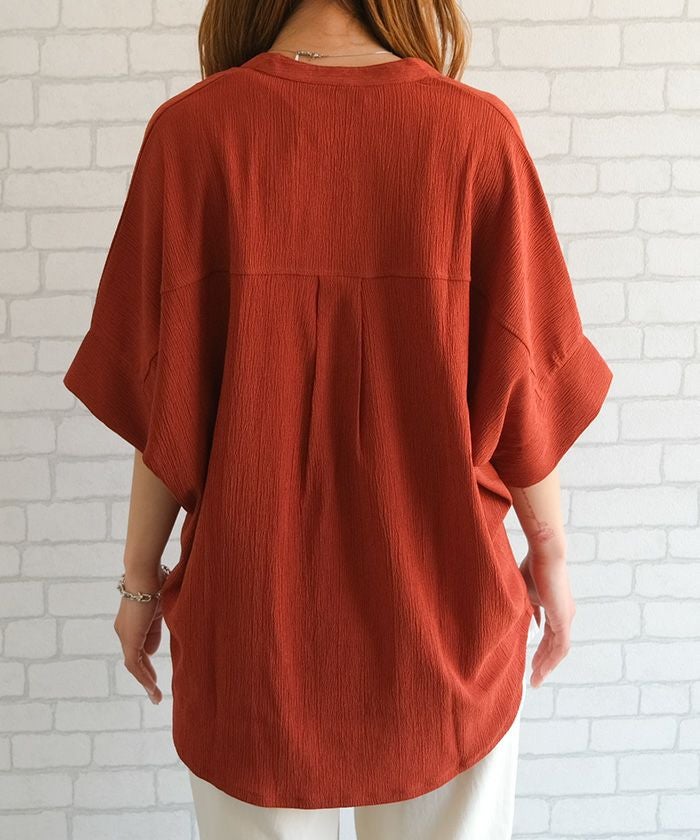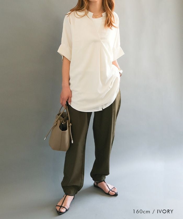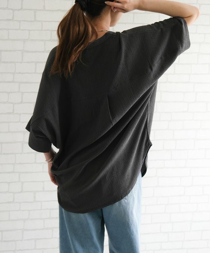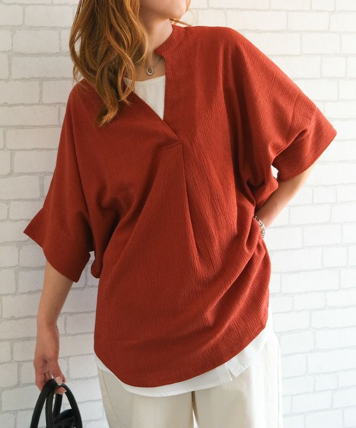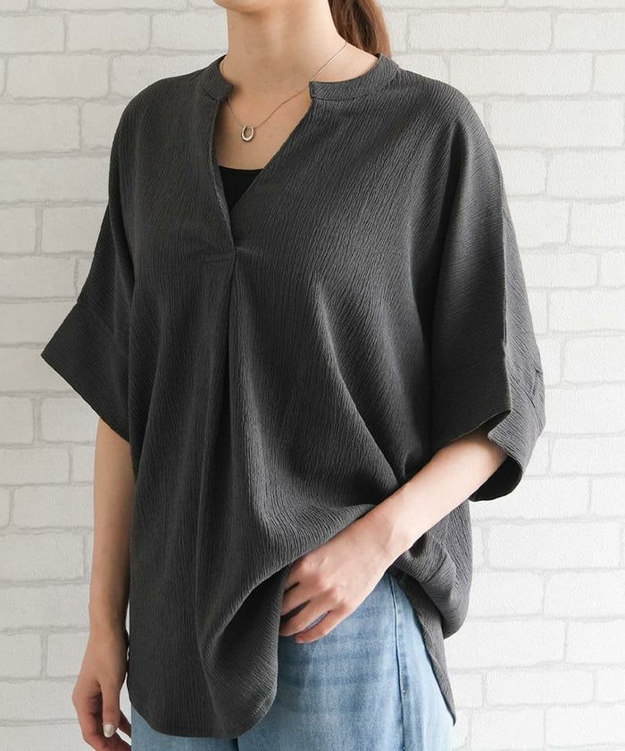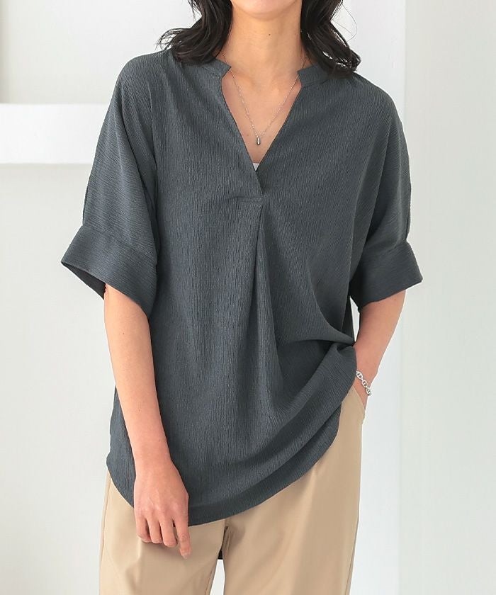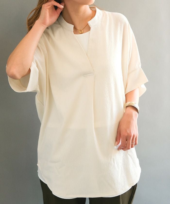 春から秋にかけて活躍する、楊柳素材のキーネックドルマンブラウスです。