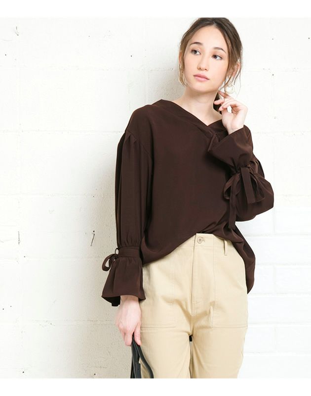 • ふんわりスリーブをキュッと絞ったリボンが、大人フェミニンなVネックブラウス。