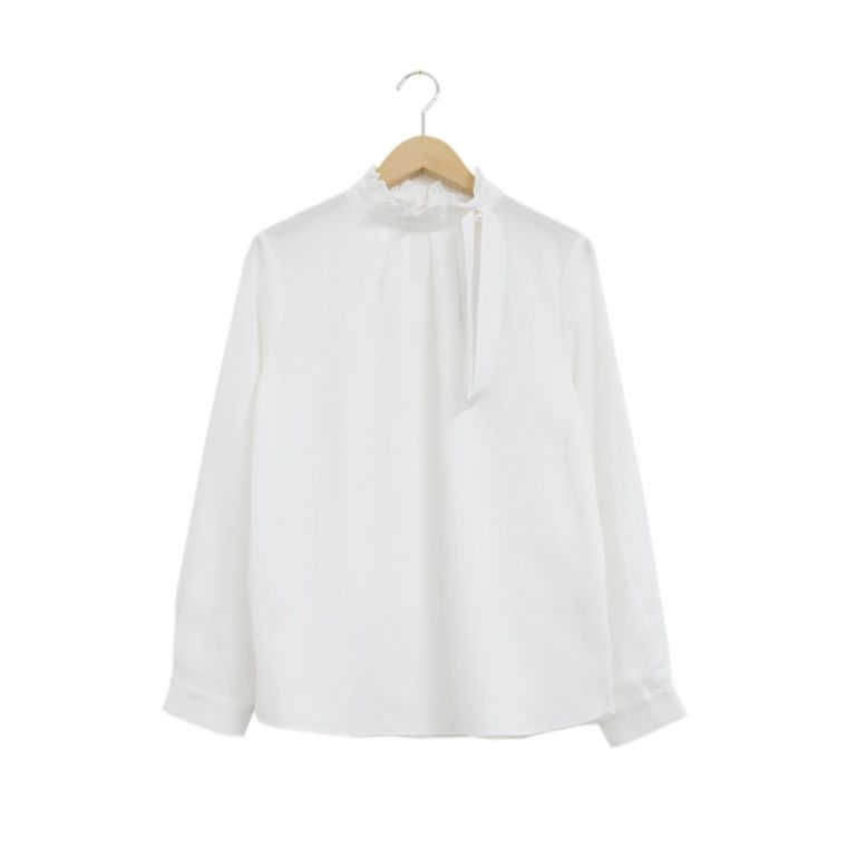顔まわりを華やかに見せるフリルスタンドカラーが魅力のブラウス。