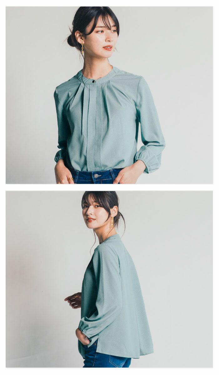 • スタンドカラーでフロントタックのシンプルなドット柄ブラウス。