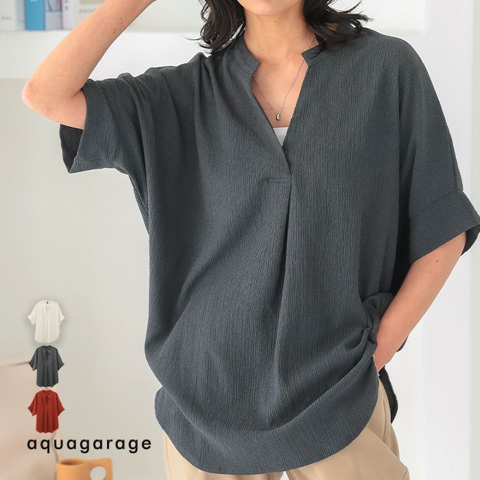 春から秋にかけて活躍する、楊柳素材のキーネックドルマンブラウスです。