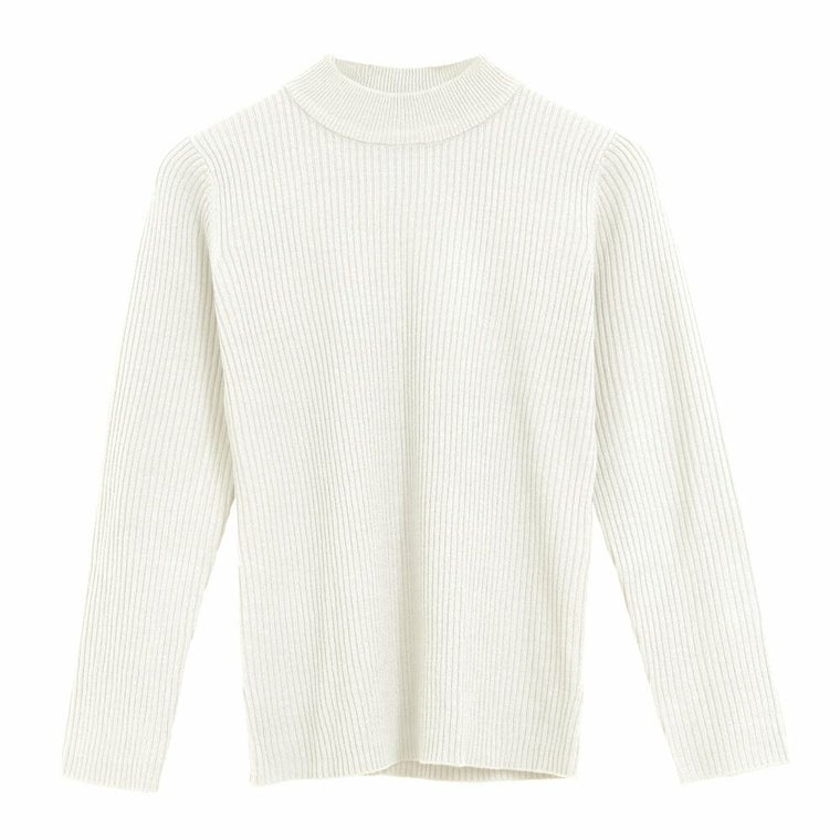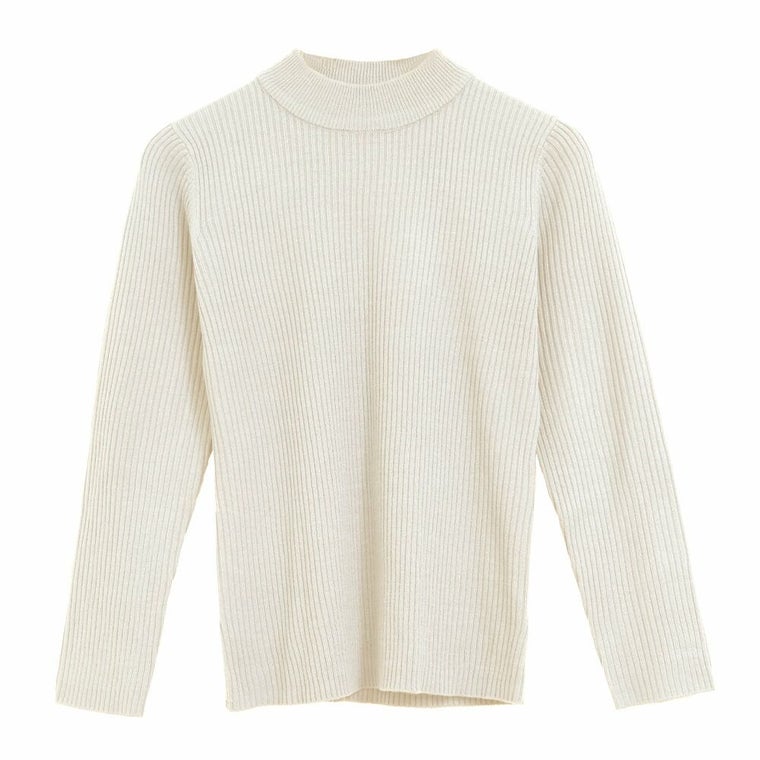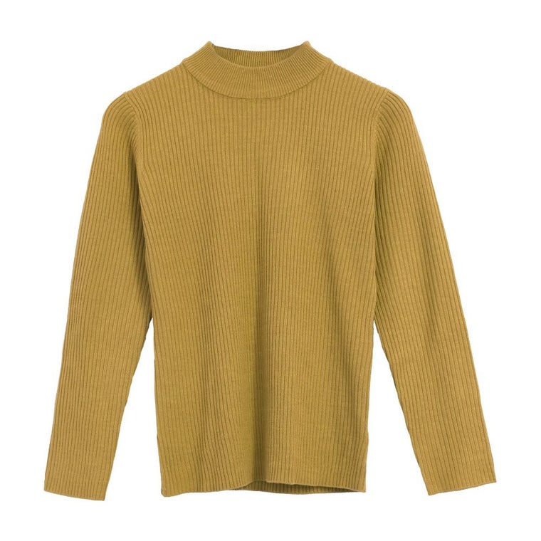 首元を上品に見せてくれるプチハイネックのニットトップス。