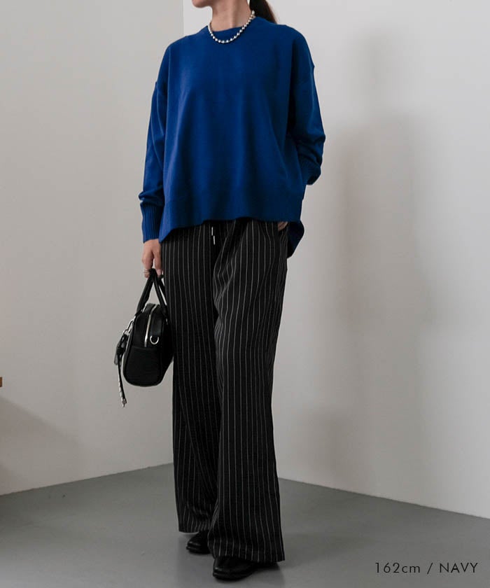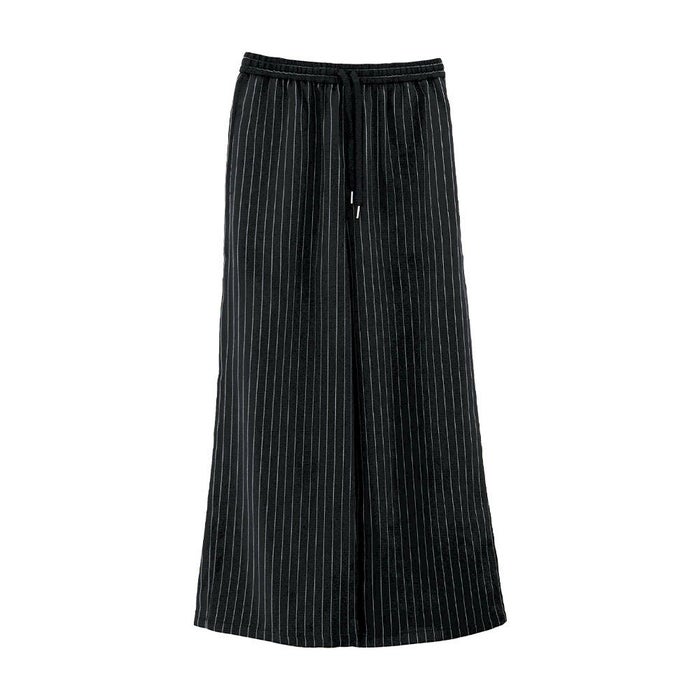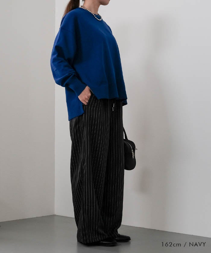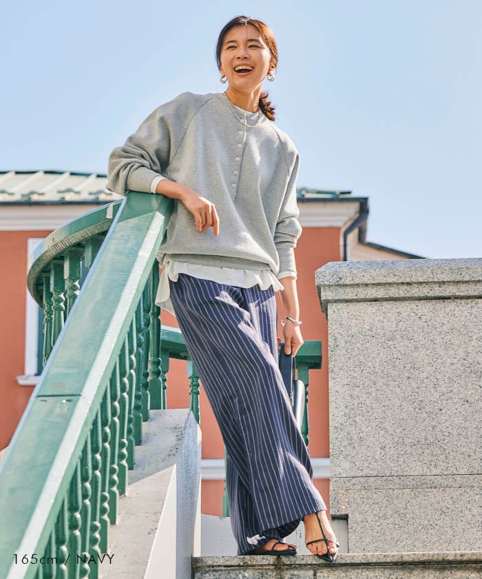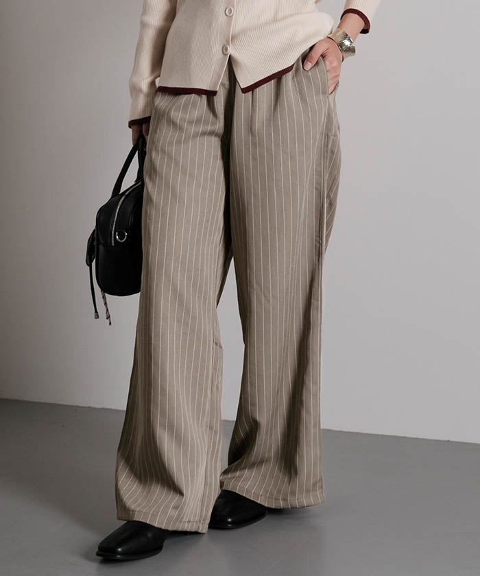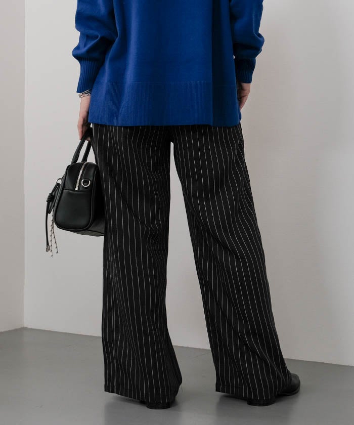 縦のラインを強調するストライプ柄が、すっきりとした印象を与えてくれるワイドパンツ。