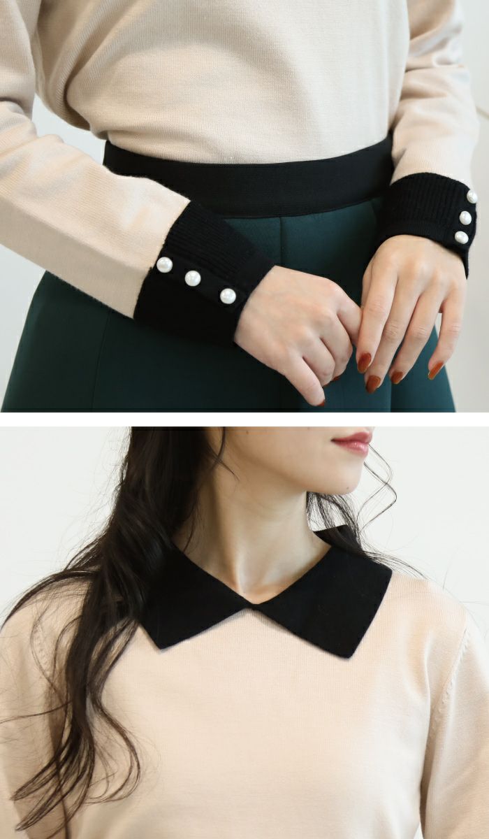 襟の配色ディテールが可愛い、ハイゲージのニットトップス。 シンプルだけどこだわりの袖のパールで上品な女性らしさを演出。 スカートにもパンツにも、幅広く着回しが利くアイテムです。