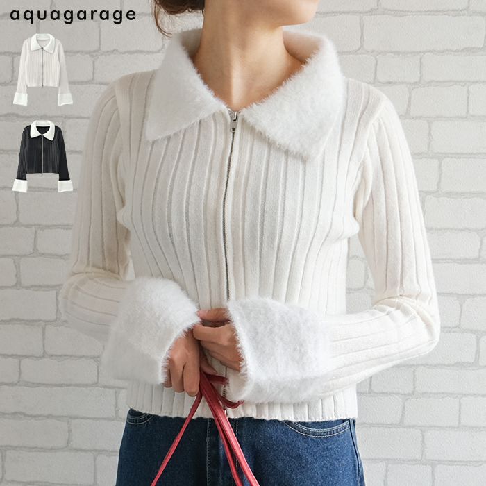 フェザーヤーン襟付きダブルジップリブニットカーディガン 春 秋 冬 | アクアガレージ aquagarage