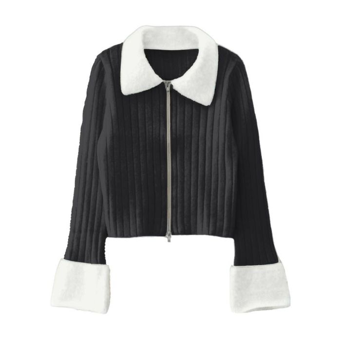 • フェザーヤーン素材を使用した襟付きのショート丈ダブルジップリブニットカーディガン
