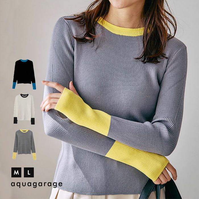• 大胆な袖口の配色がアクセントの指穴付きバイカラーリブニット