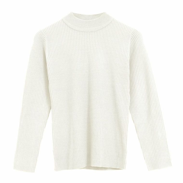 首元を上品に見せてくれるプチハイネックのニットトップス。