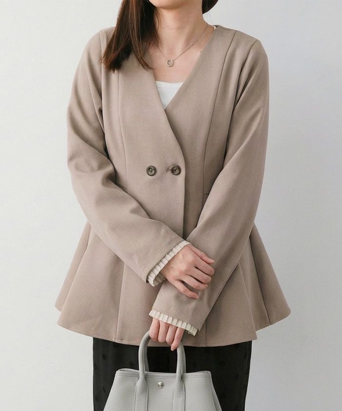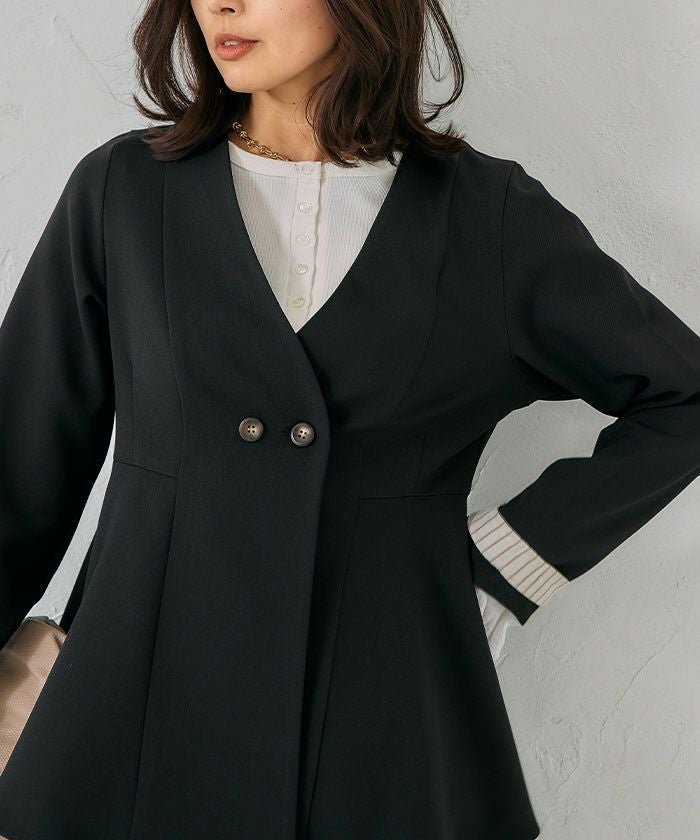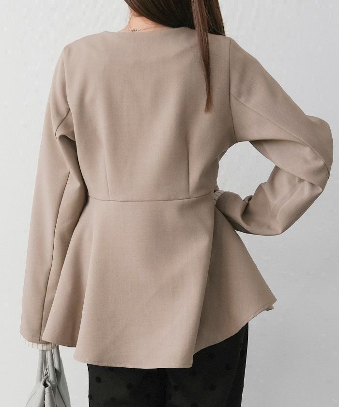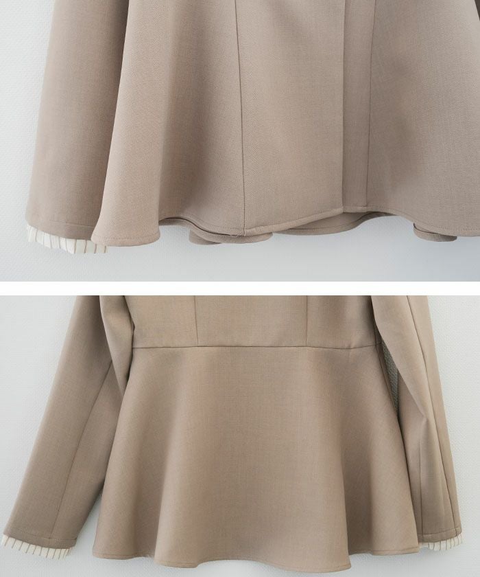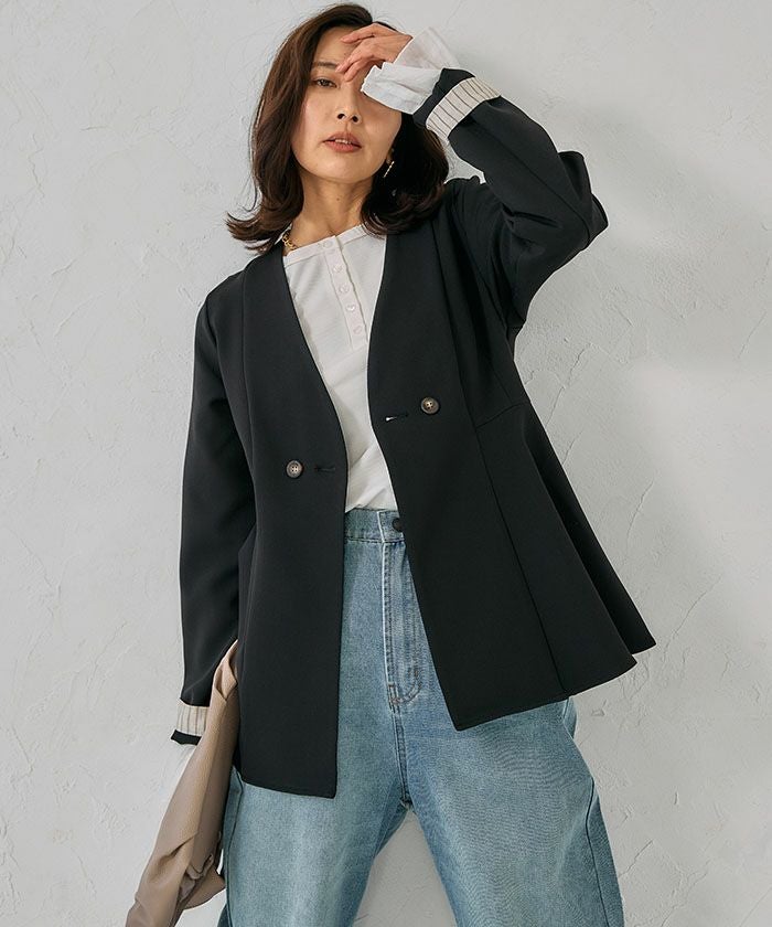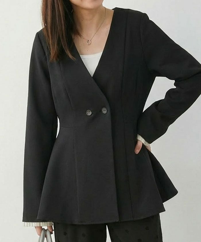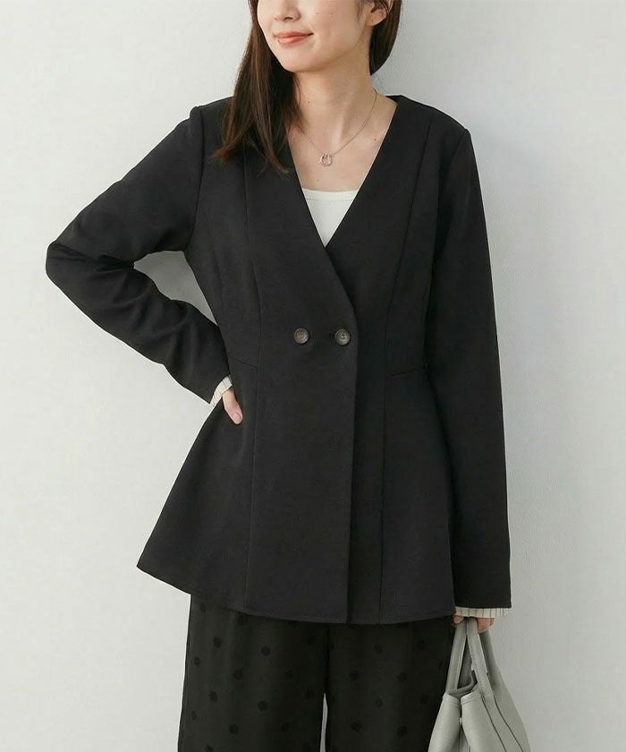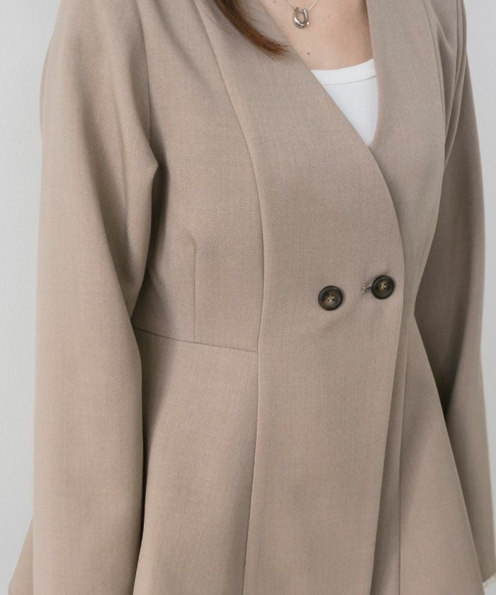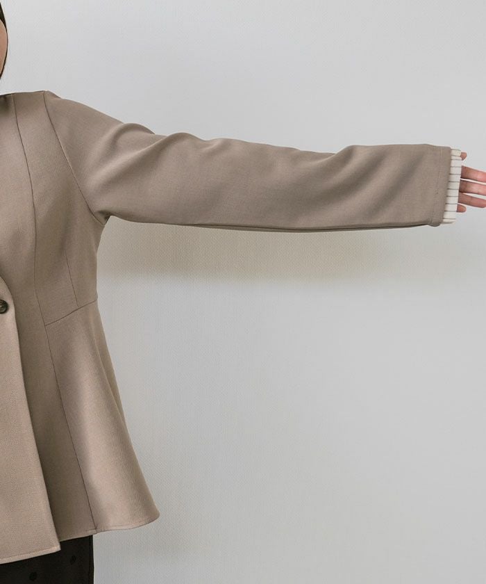 ウエストラインを美しく引き立てる、ノーカラー仕様のペプラムジャケット。