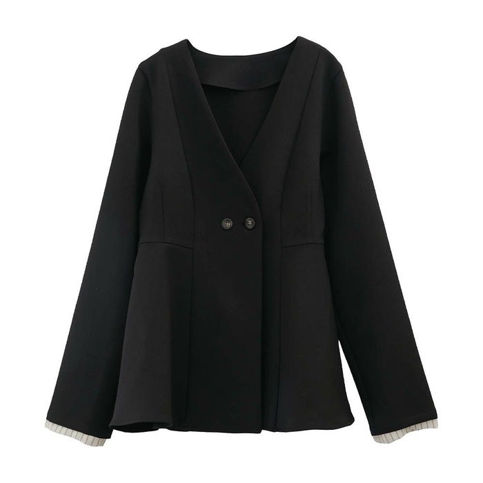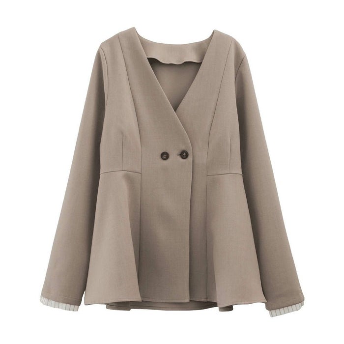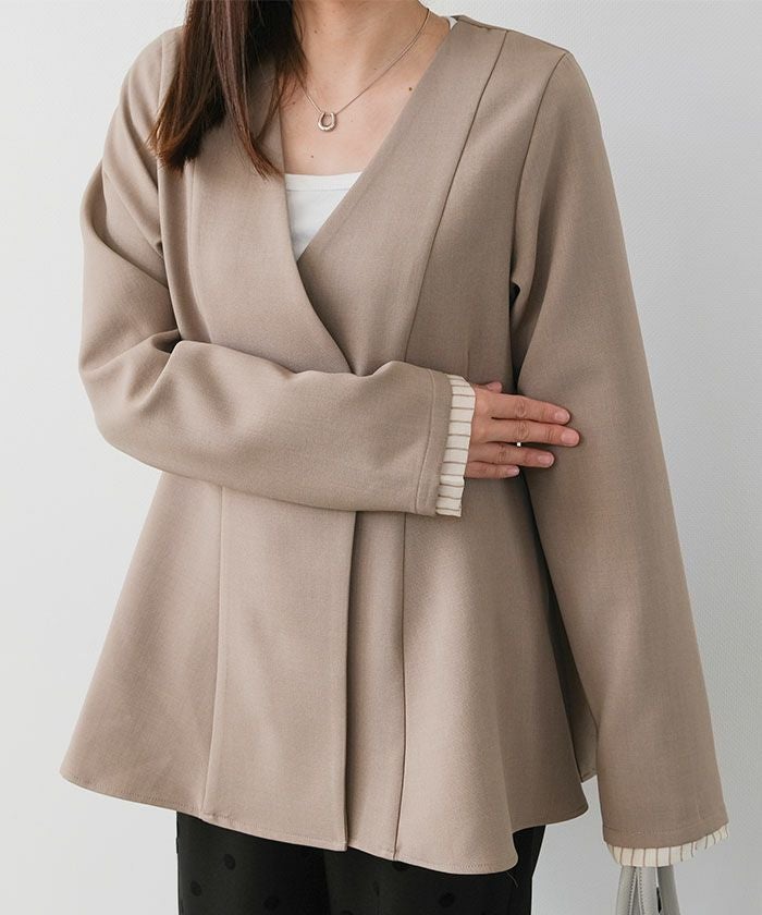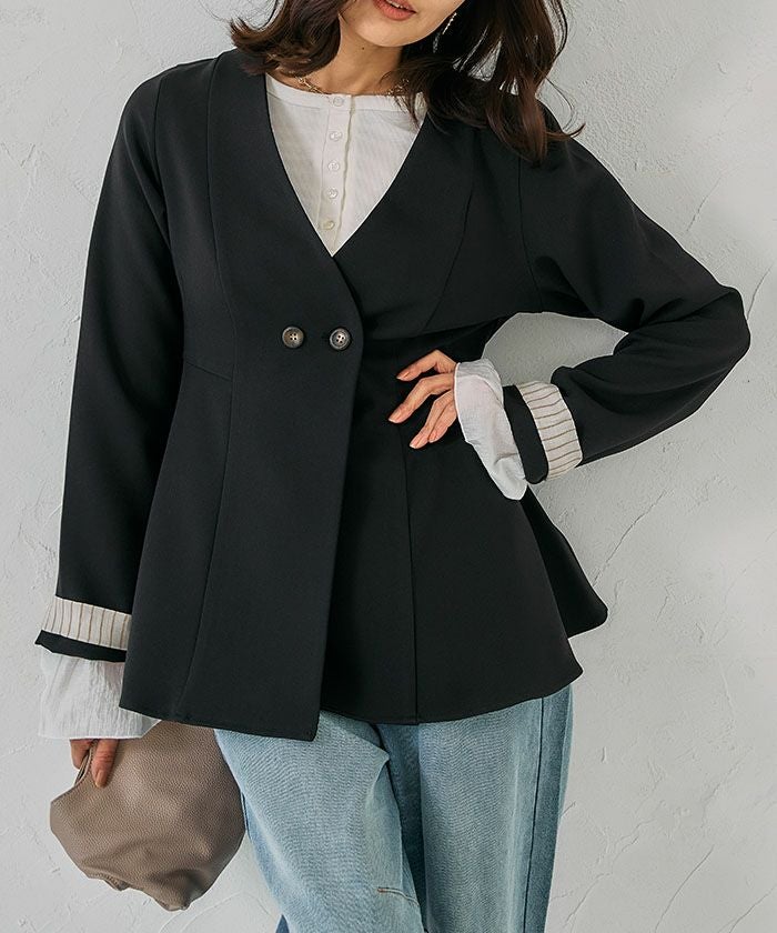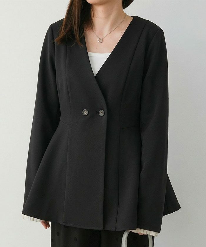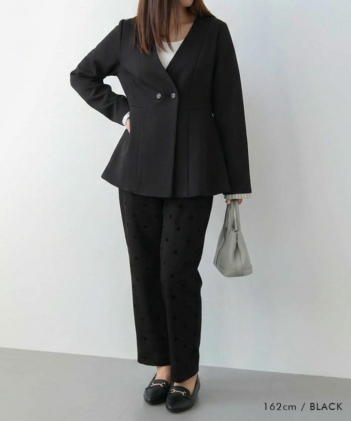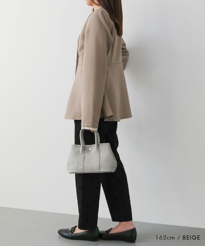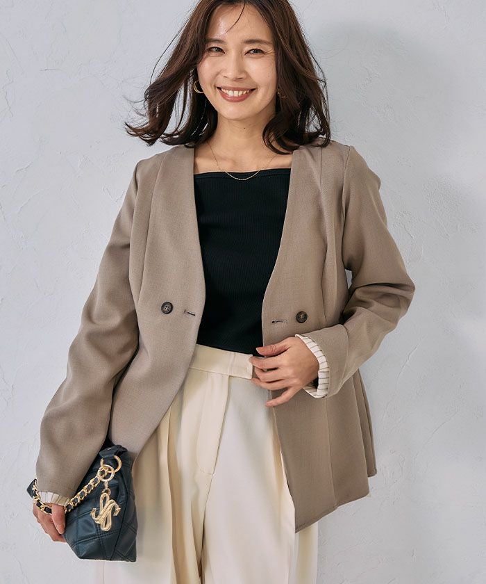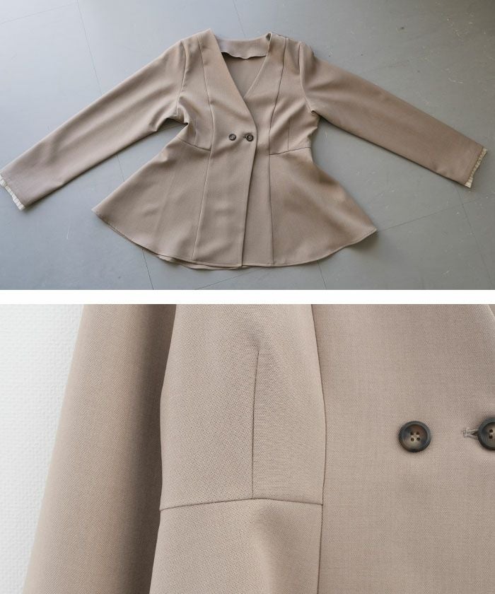 ウエストラインを美しく引き立てる、ノーカラー仕様のペプラムジャケット。
