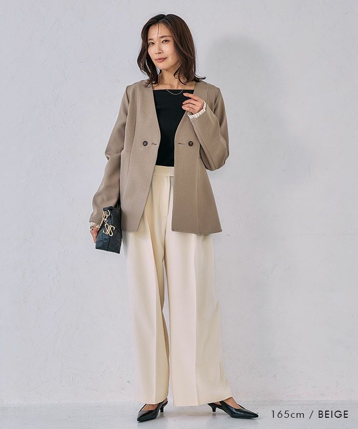 顔まわりをすっきり見せてくれるノーカラーデザインは、インナーを選ばず着回し力も抜群。