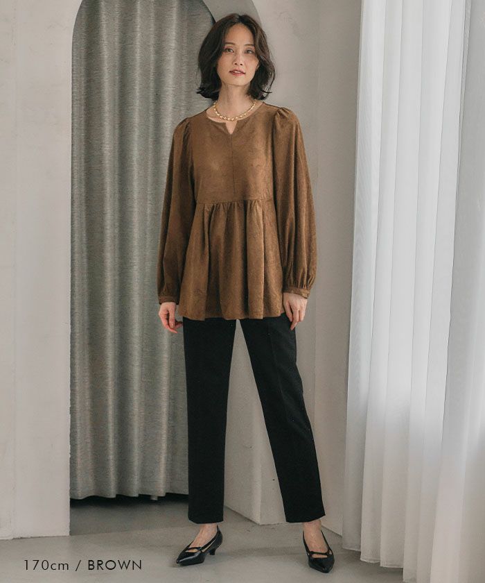 上品な大人の女性らしさを引き立てる、スエード調のペプラムトップス。