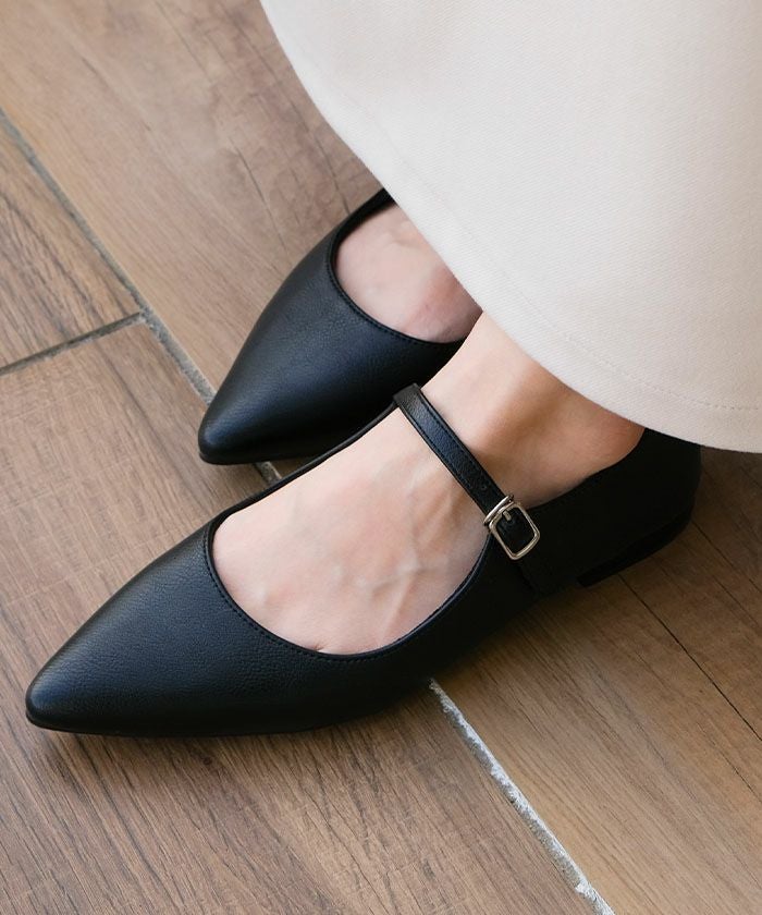 ストラップ付きデザインは、スカートにもパンツにも好相性で、足首をさりげなく引き締めて見せてくれる効果も。