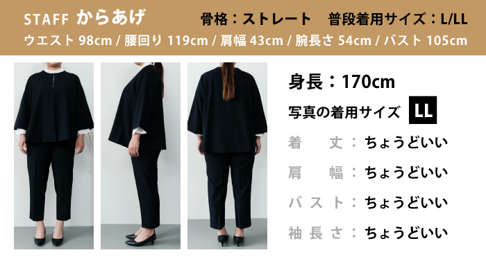 156cm、56kgで、普段はLサイズを買うことが多いです。スタッフさんのレビュー参考にしてLサイズは大きめかなと思い、Mサイズにしました。 パンツはゴムなのでラクに履けました。上着もゆったりなのでキレイに着ることができます。 セレモニー、普段にも着れる感じなのでたくさん着たいです。