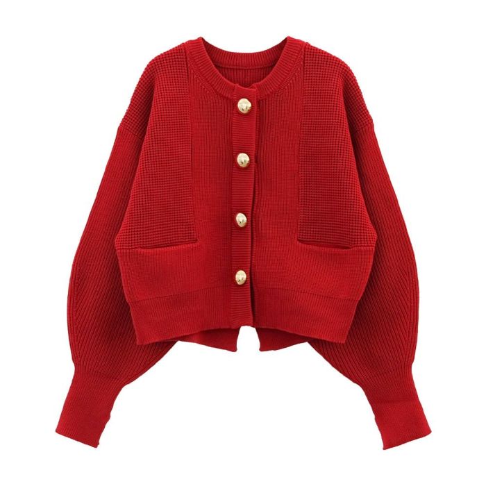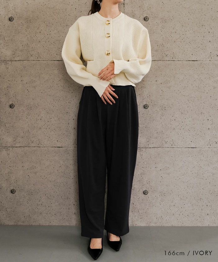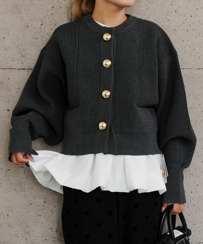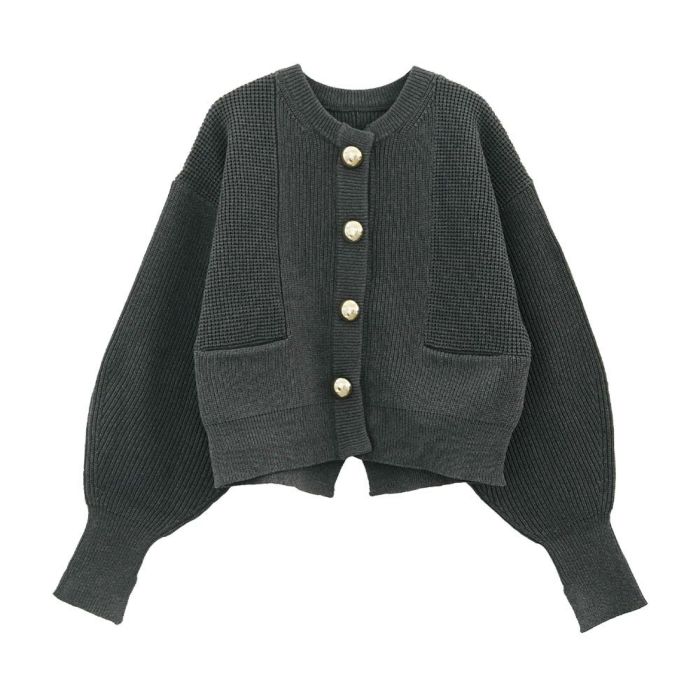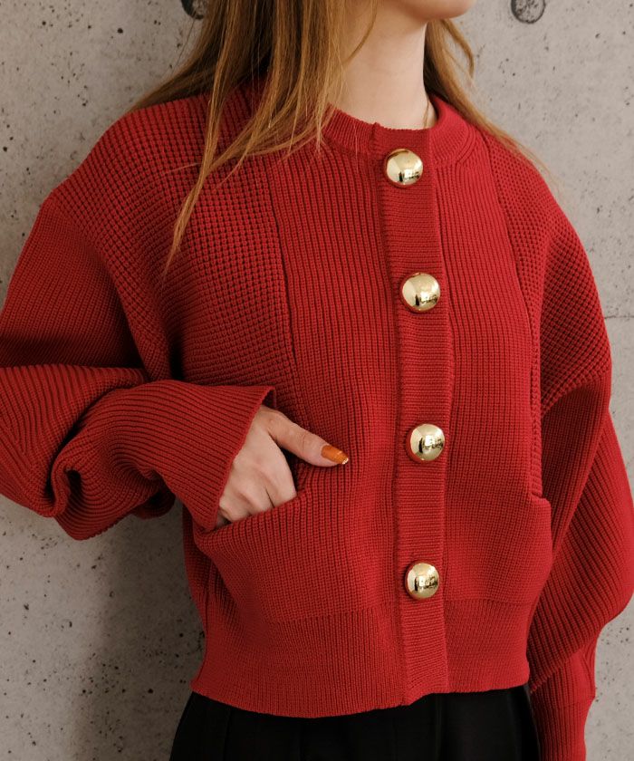 大きなゴールドボタンが目を惹く、存在感たっぷりのショート丈ニットカーディガン。