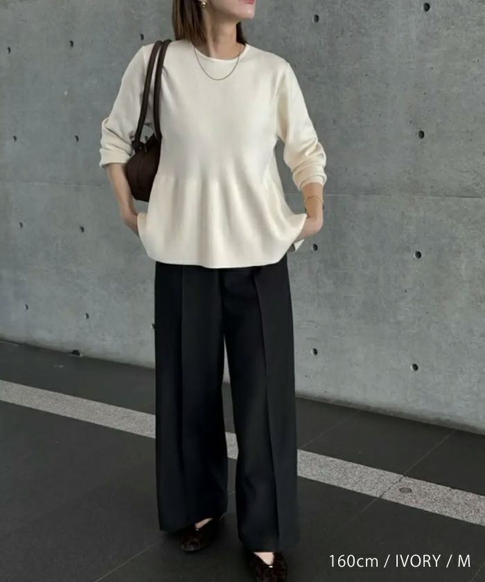 細身のデニムやスラックスにさらりとイン。ウエストの絞りとフレアが自然に映え、スタイルアップ効果は抜群です。