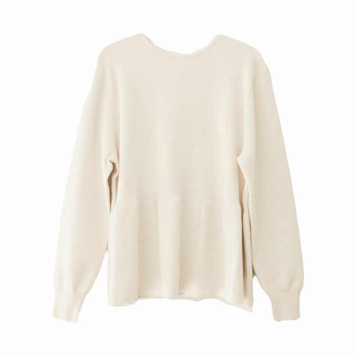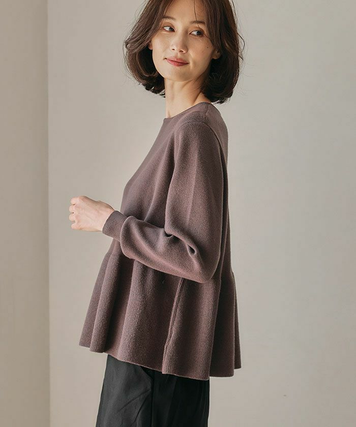 背後から見せる素敵な仕掛けが魅力の「バックパールフレアニットトップス」。