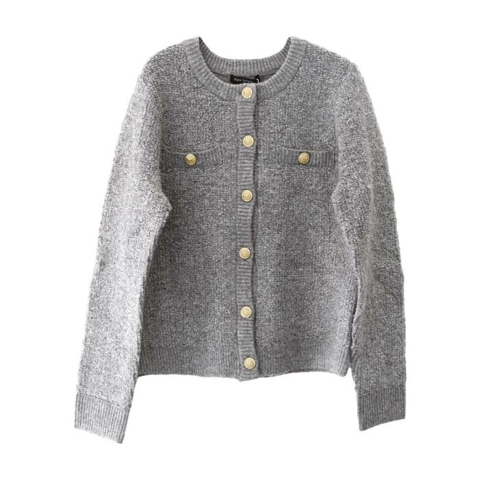 アクセサリーやバッグでゴールドを取り入れると、ボタンの輝きとリンクしてまとまりのあるスタイルが完成します。