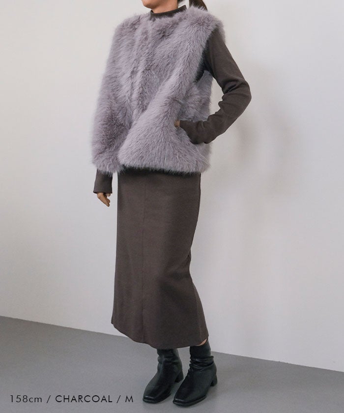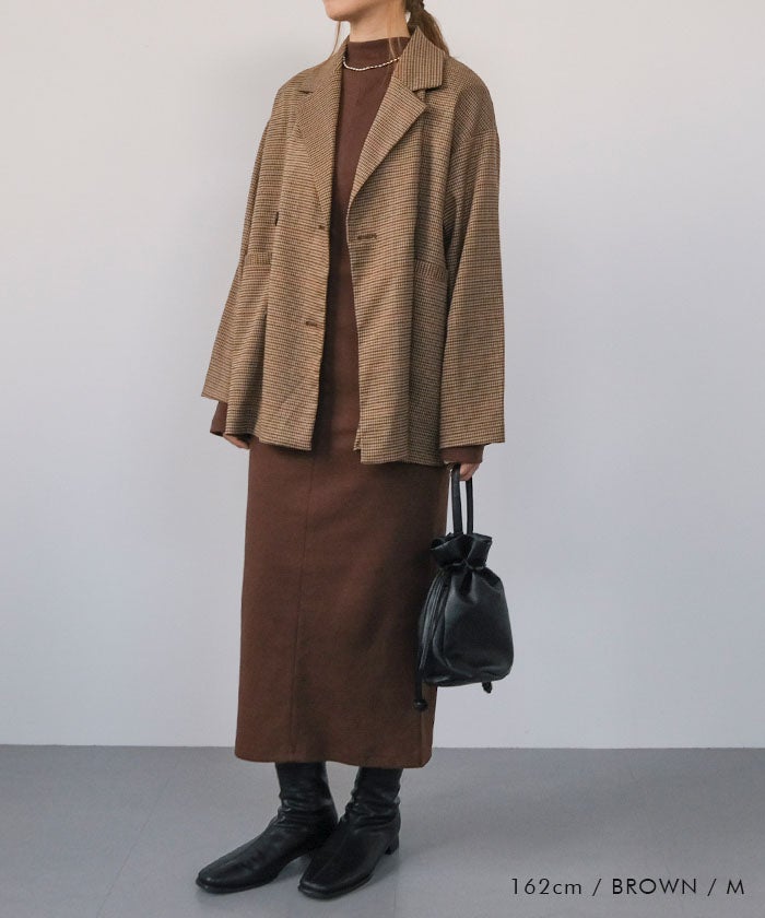 ショート丈のジャケットやカーディガンとの相性もよく、シルエットの縦ラインを活かしたままバランスよくスタイリング可能。