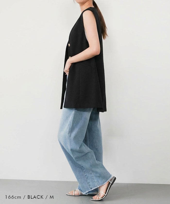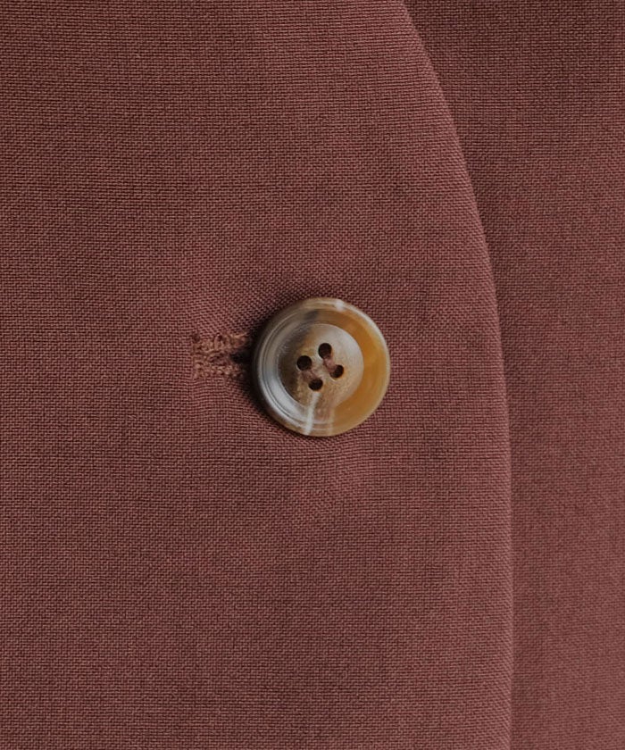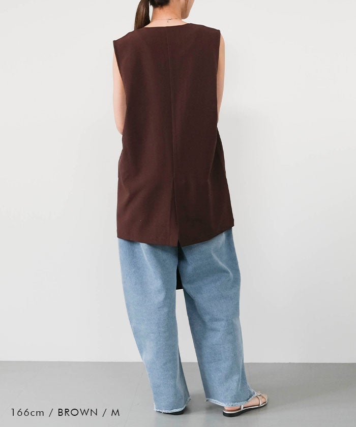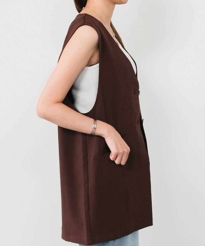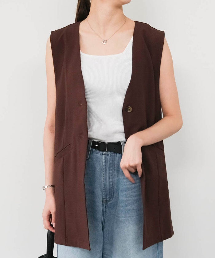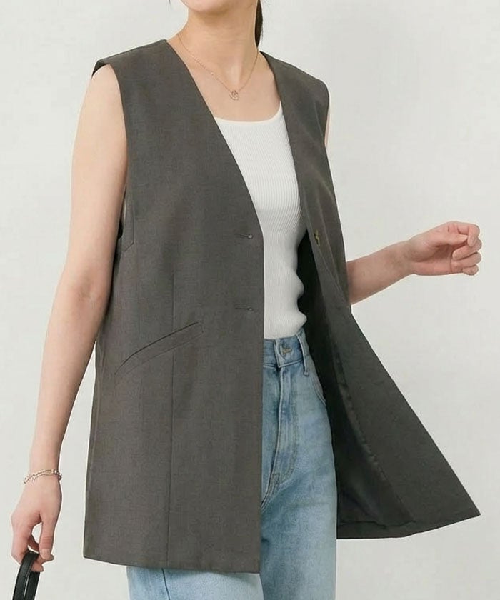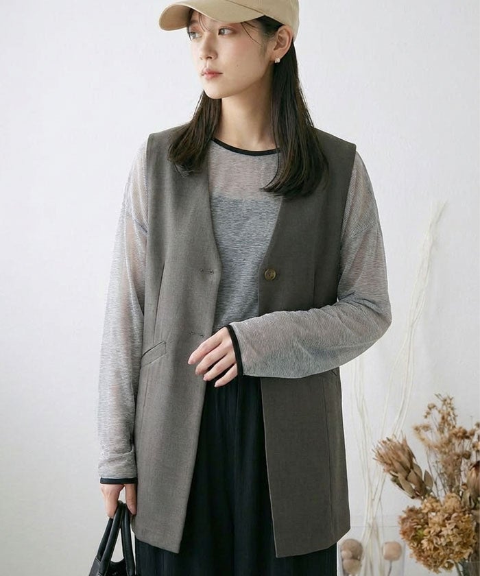 首元はすっきりとしたノーカラー仕様で、顔まわりを軽やかに見せながらインナーとのレイヤードも楽しみやすい仕上がりに。