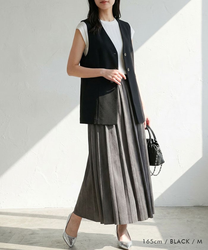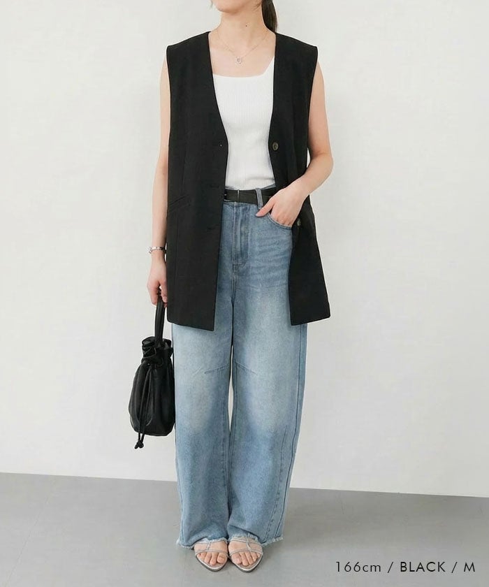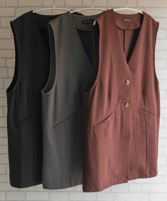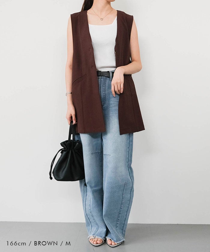 ワンピースの上に重ねることで縦のラインが強調され、スタイルアップ効果も期待できます。