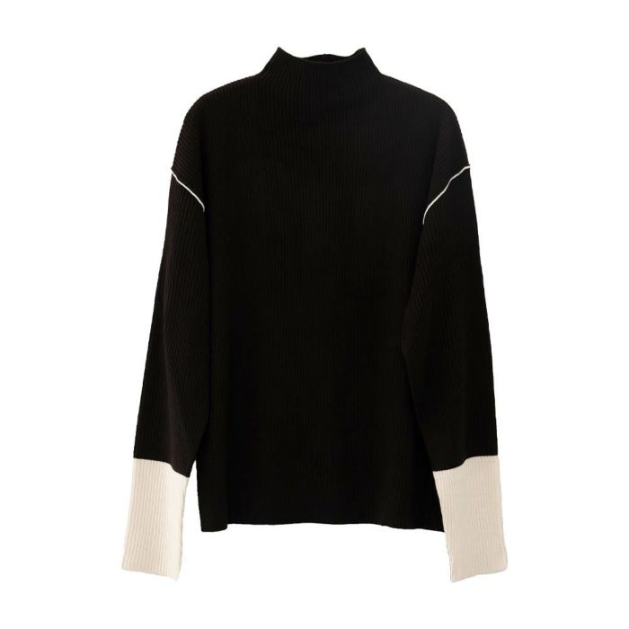 首元をすっきりと見せてくれるボトルネックに、さりげない配色ラインを効かせたリブニットトップス。