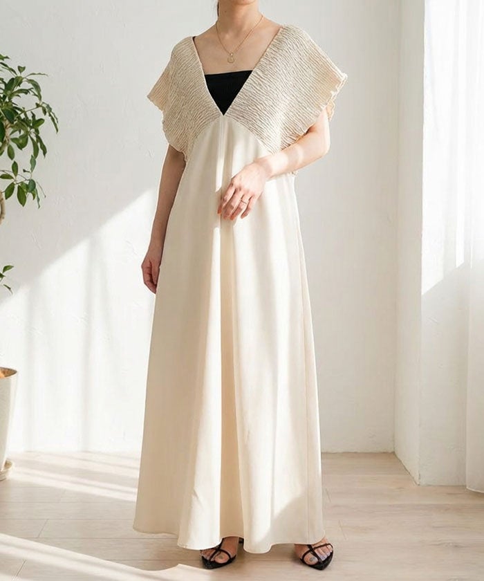 女性らしさを引き立てるシャーリングディテールが魅力のロングワンピース。