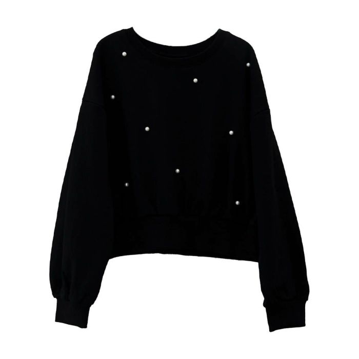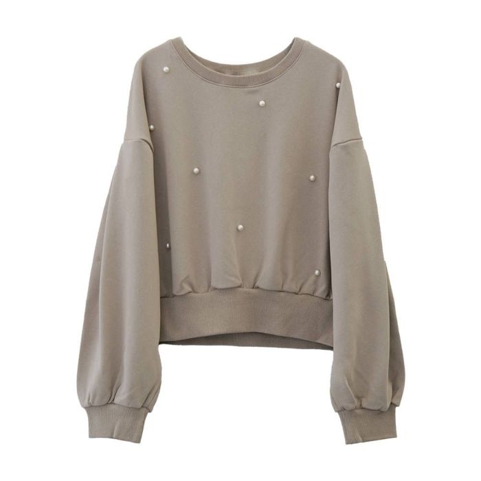 ふんわりとしたボリュームスリーブにパールをあしらった、女性らしさが際立つデザイントップス。