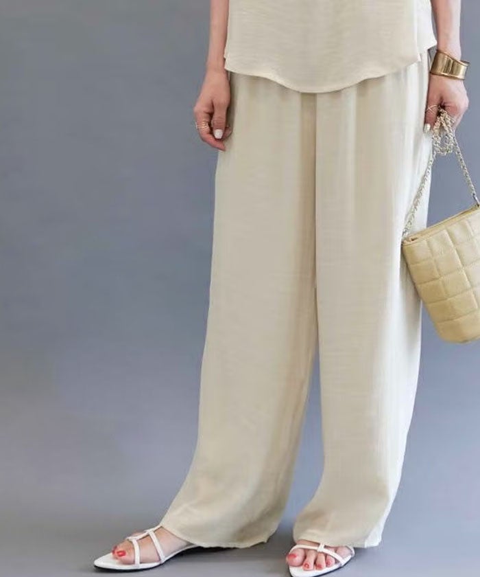 素材的に夏〜初秋くらいまでかなと思いますが、サラサラの着ごごち、安っぽくないほどよい光沢感、安っぽくないウエストのゴムの感じ、めちゃくちゃ高みえパンツでした。 縫製も、安物特有の雑な感じや、ガタガタ感なく、問題なさそう。 まだ洗濯をしてないので、洗った後のシワの感じやアイロンのかけやすさなどは、まだ不明ですが、今のところおすすめしたい商品のひとつでした。