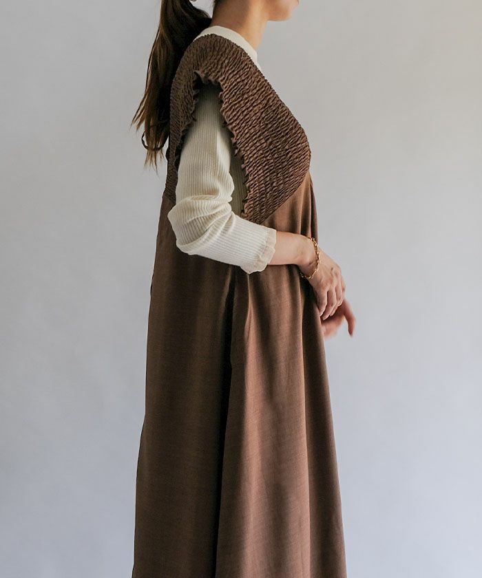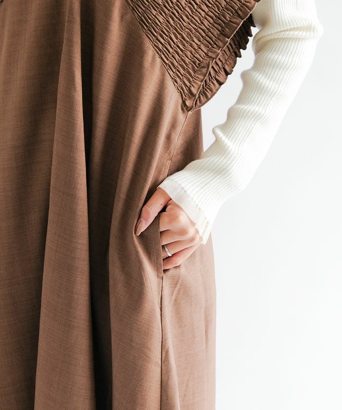 女性らしさを引き立てるシャーリングディテールが魅力のロングワンピース。