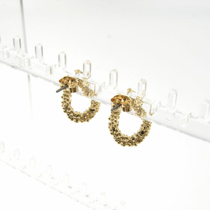 光を受けて煌めく小さな粒を集めたようなモチーフが存在感を放ちます。 程よい輝きを放つ個性的なシルエットは大人コーデのアクセント使いにも◎